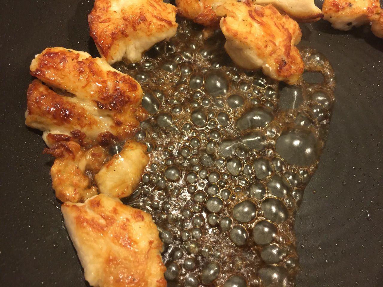 ④余分な油をキッチンペーパーで拭き取り、(照り焼きのタレ)を回しかける。鶏肉に絡めながら煮詰める。