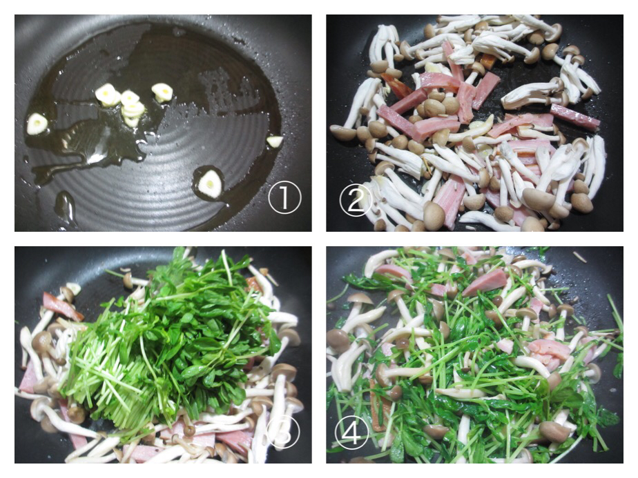 豆苗は、火を通しすぎると、シャキシャキ感がなくなるので、フライパンに入れたら、強めの火で一気に炒めて下さい。