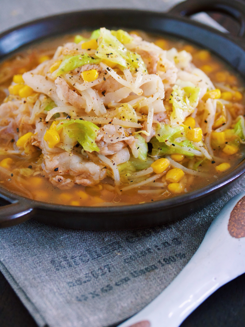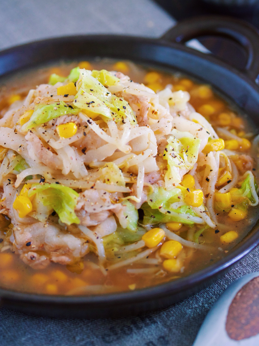 豚バラ薄切り肉にもみ込んだ片栗粉のお蔭で、自然にとろみがつきます。