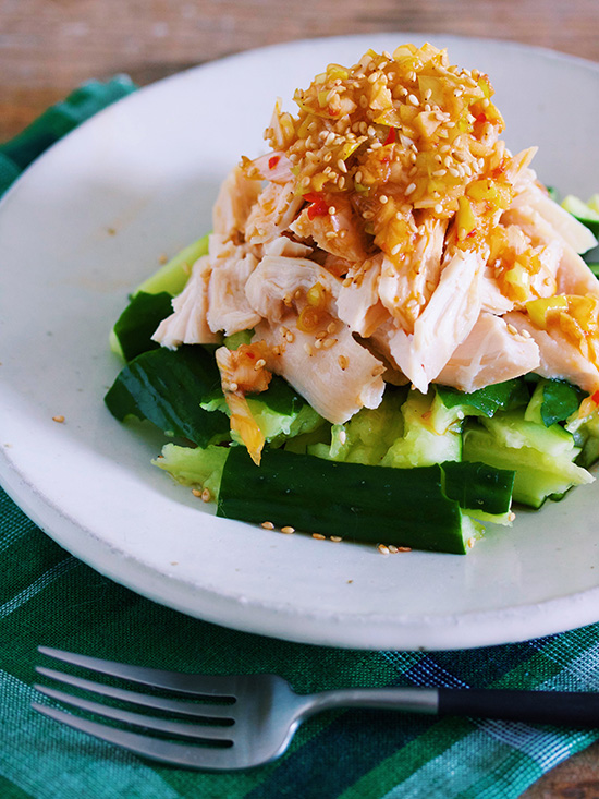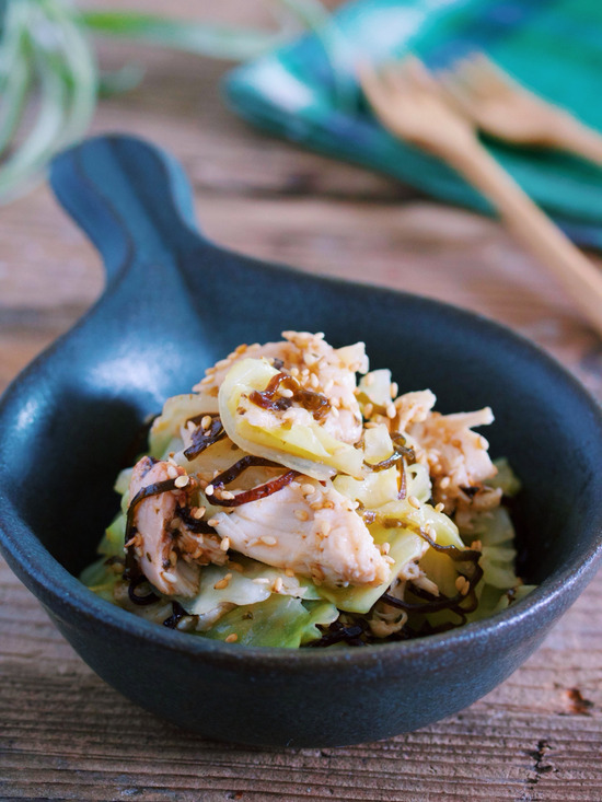 『蒸し鶏とキャベツの梅塩こんぶ和え』