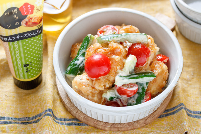 むね肉をフライパンで揚げ焼きにし、叩いたきゅうりと半分に切ったミニトマトと共に、ガーリック+ハニーマヨソースで和えました。マヨネーズとはちみつチーズめんたいを合わせることで、酸味がマイルドになり、お子様も喜ぶ一品に。また、フレッシュな野菜が入ることで、油ものもさっぱり食べられますよ♪とっても簡単で冷めても美味しいので、ぜひ!!