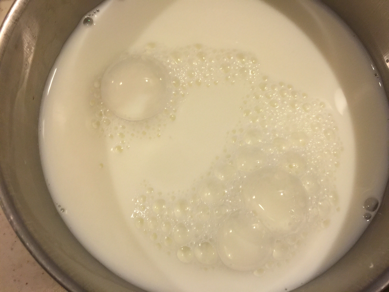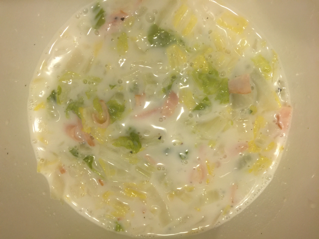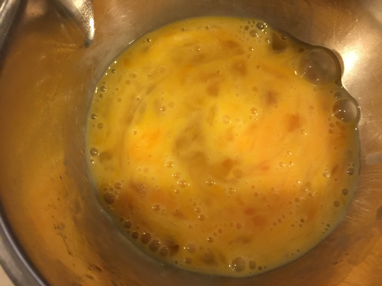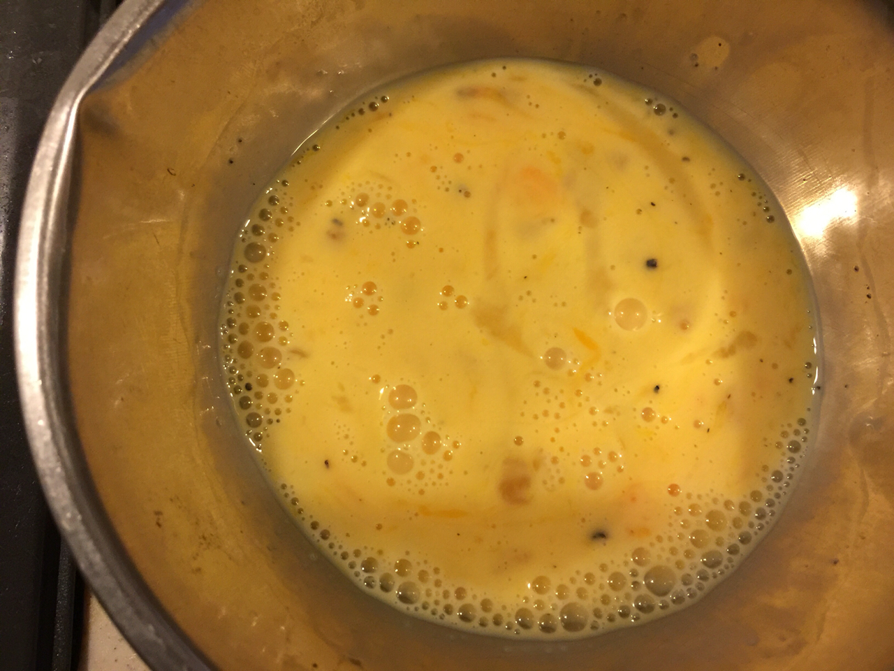 ③牛乳を少しずつ加え、ダマにならないように、その都度、よく混ぜ合わせる。牛乳を入れ終わったら、①の蒸し汁も加えて、再度よく混ぜ合わせる。