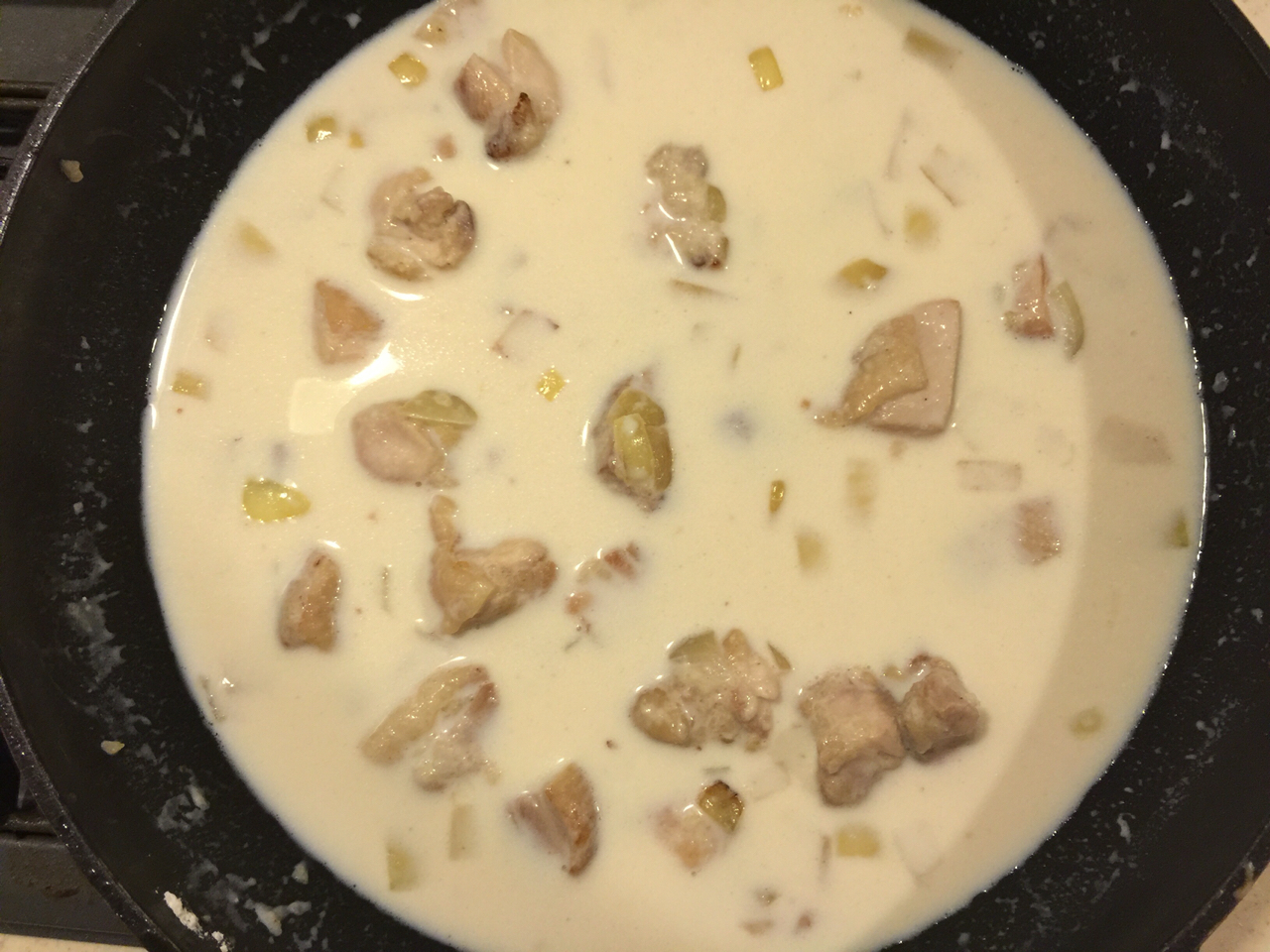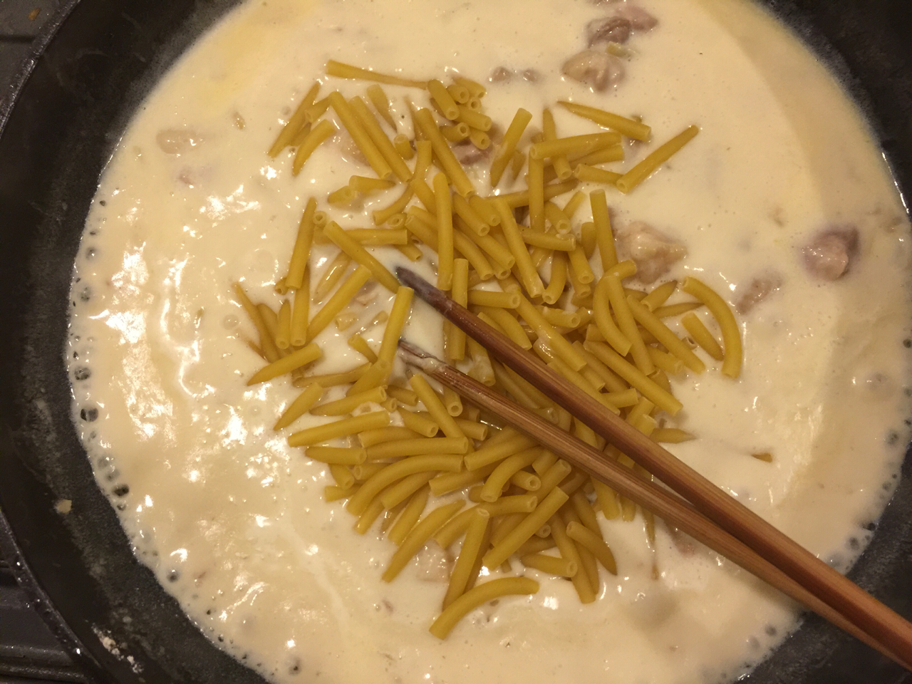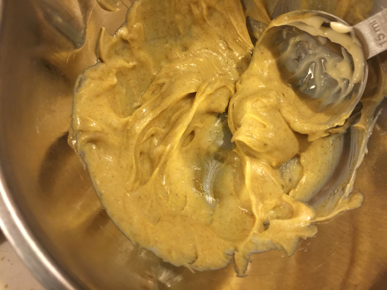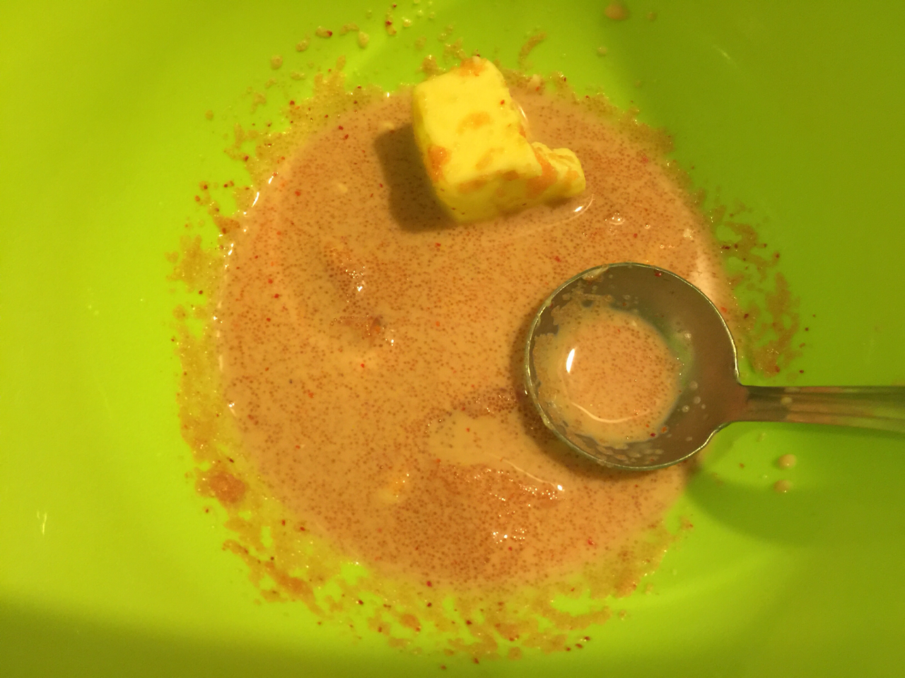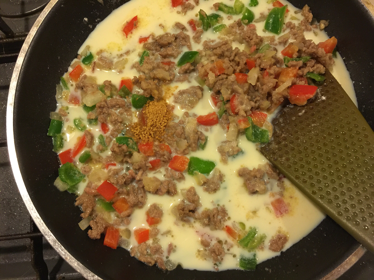 ③牛乳を少しずつ加え、ダマにならないように、その都度、よく混ぜ合わせる。牛乳を入れ終わったら、①の蒸し汁も加えて、再度よく混ぜ合わせる。