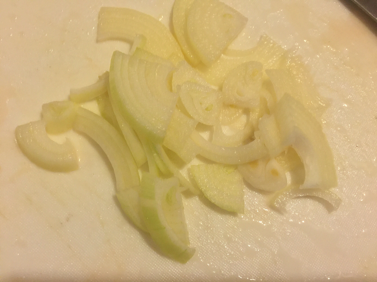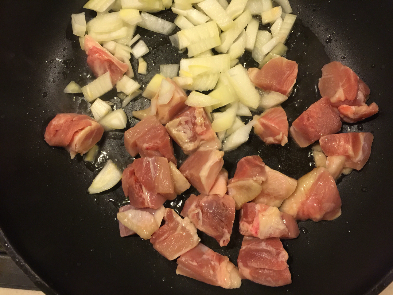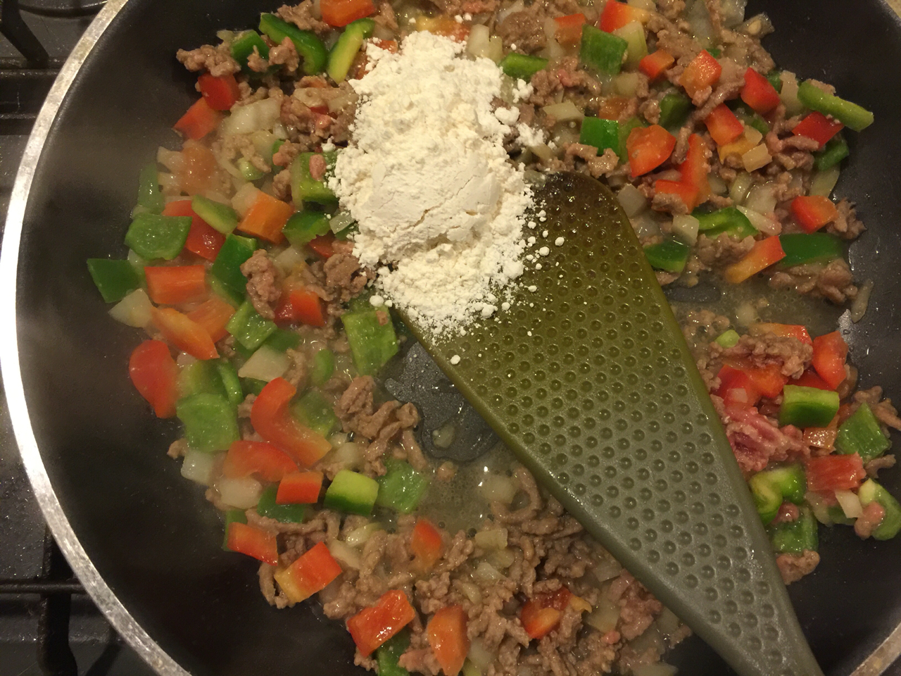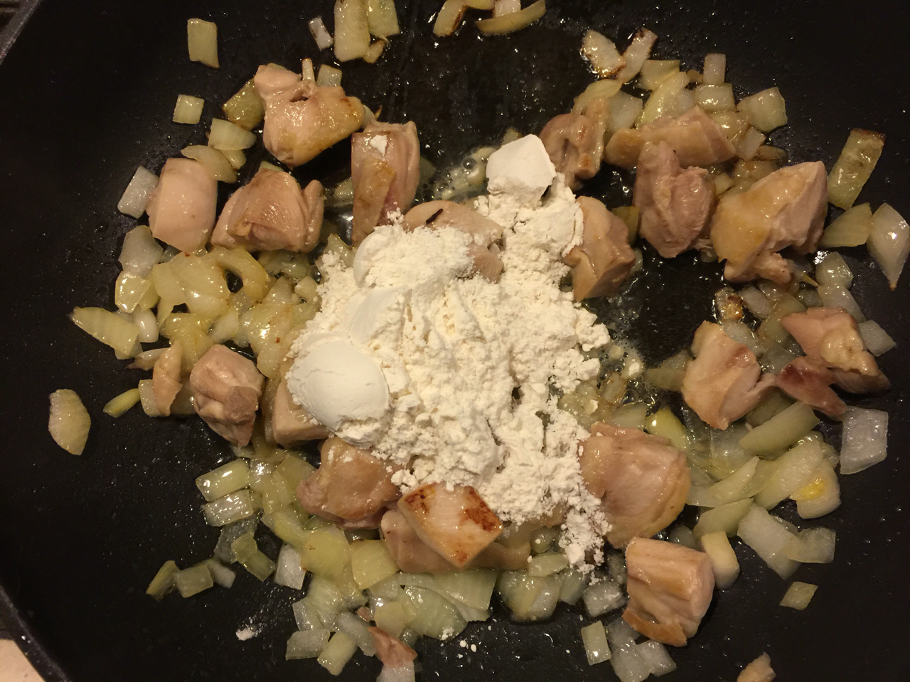 ②フライパンにオリーブオイルを熱し、玉ねぎを炒める。玉ねぎが透き通ってきたら、薄力粉を加えて、粉っぽさがなくなるまで炒める。