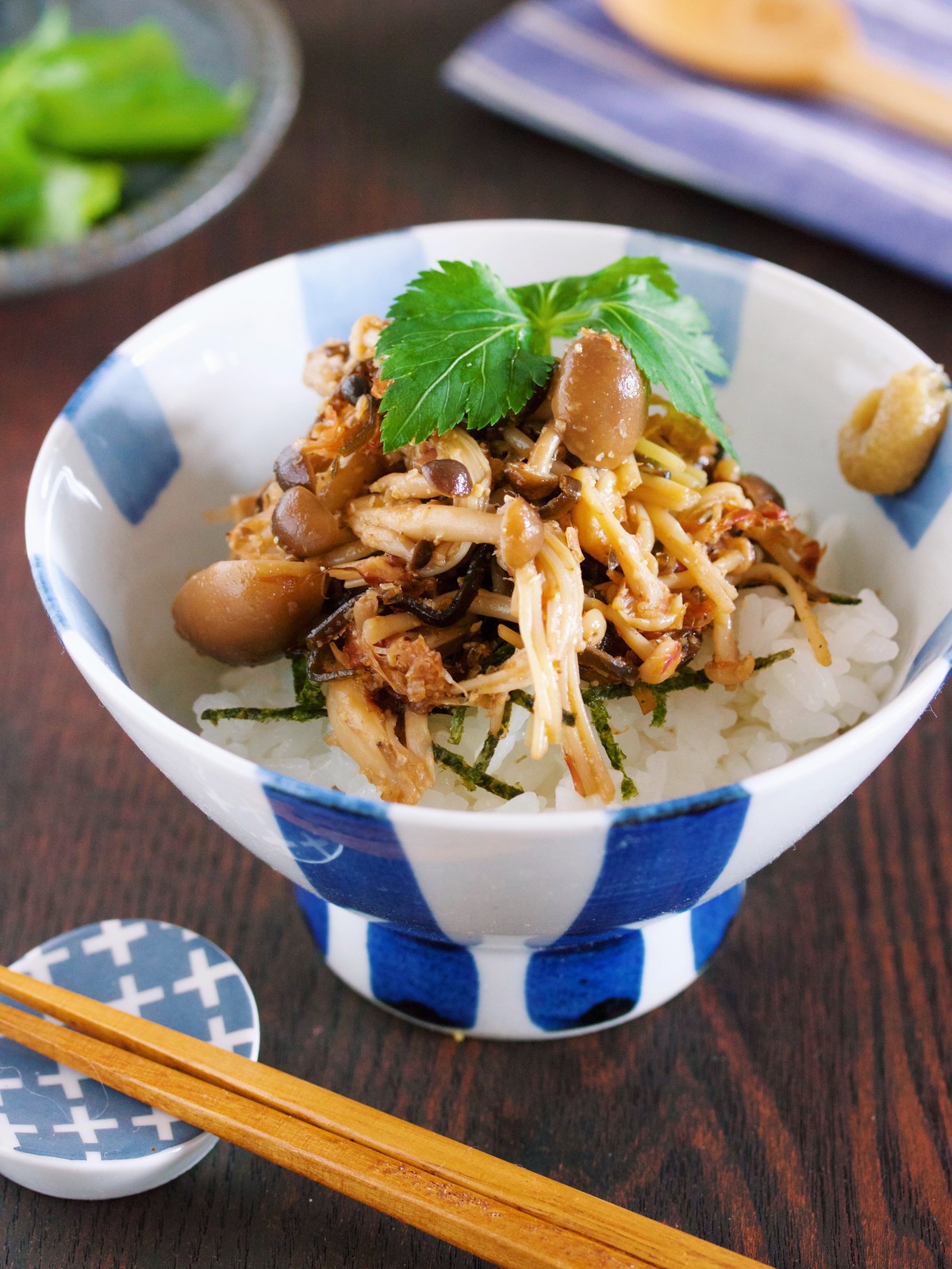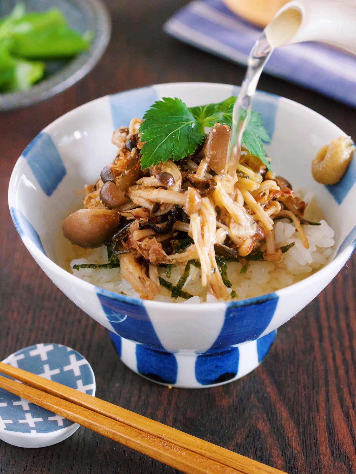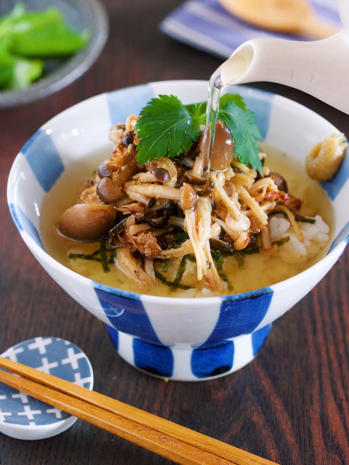 塩昆布とかつお節であえた”たっぷりきのこ”をごはんに乗せ、熱々のだし汁を注ぐだけ♪だし汁には、旨味が凝縮され、ゴクゴク飲み干したくなる美味しさ♡きのこだけとは思えないほどの満足感があるので、食欲がない時や、夜遅い食事にもオススメです♪