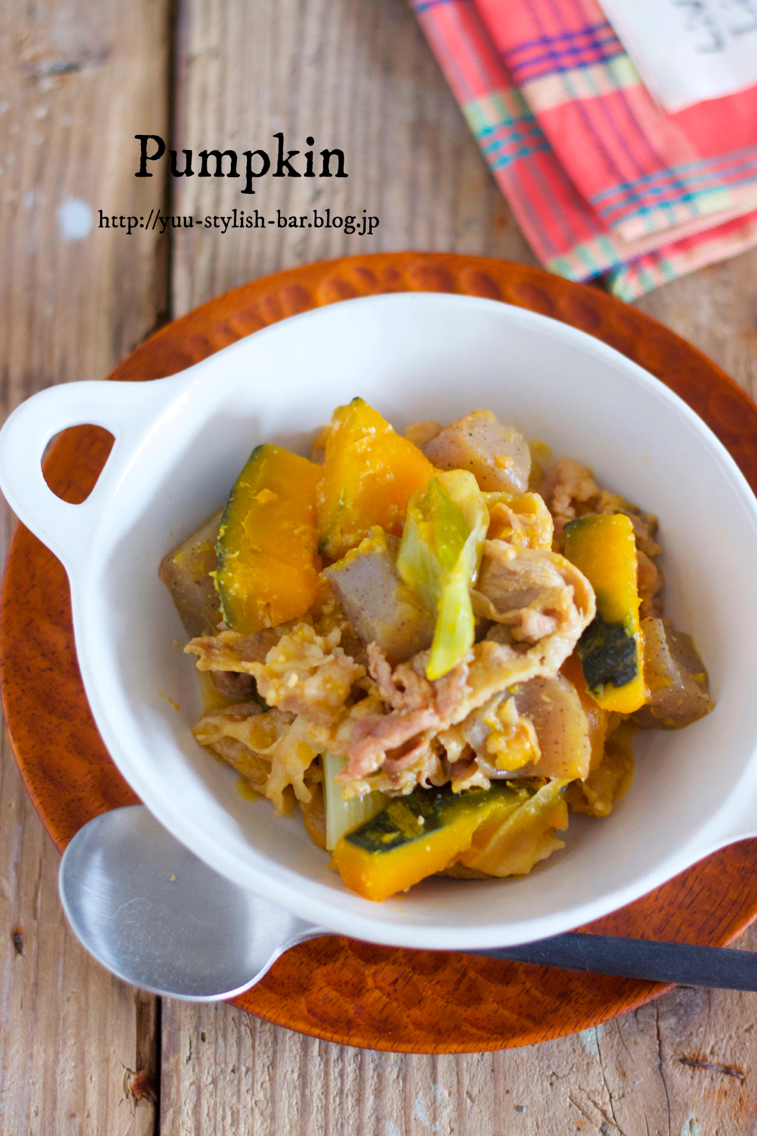 お鍋に重ねて放置で10分♪身体がポカポカ♪『豚こまとかぼちゃの具沢山味噌煮込み』