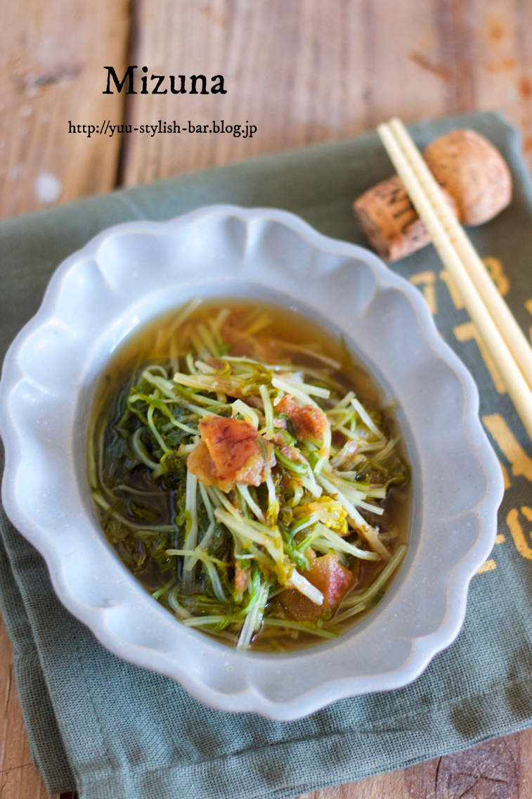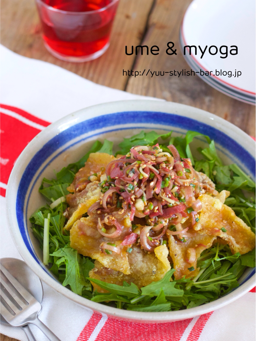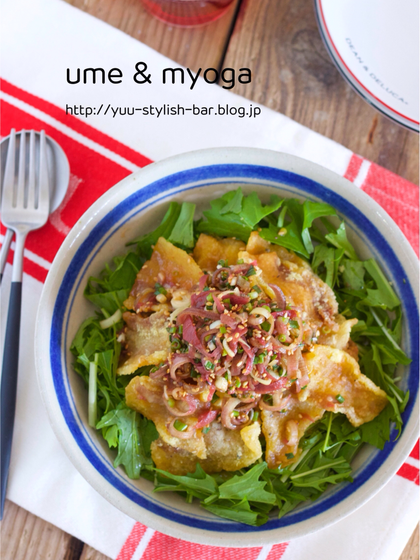 野菜がモリモリいける♡サッパリ♡『カリカリ豚バラと水菜のサラダ〜梅みょうがドレッシング〜』