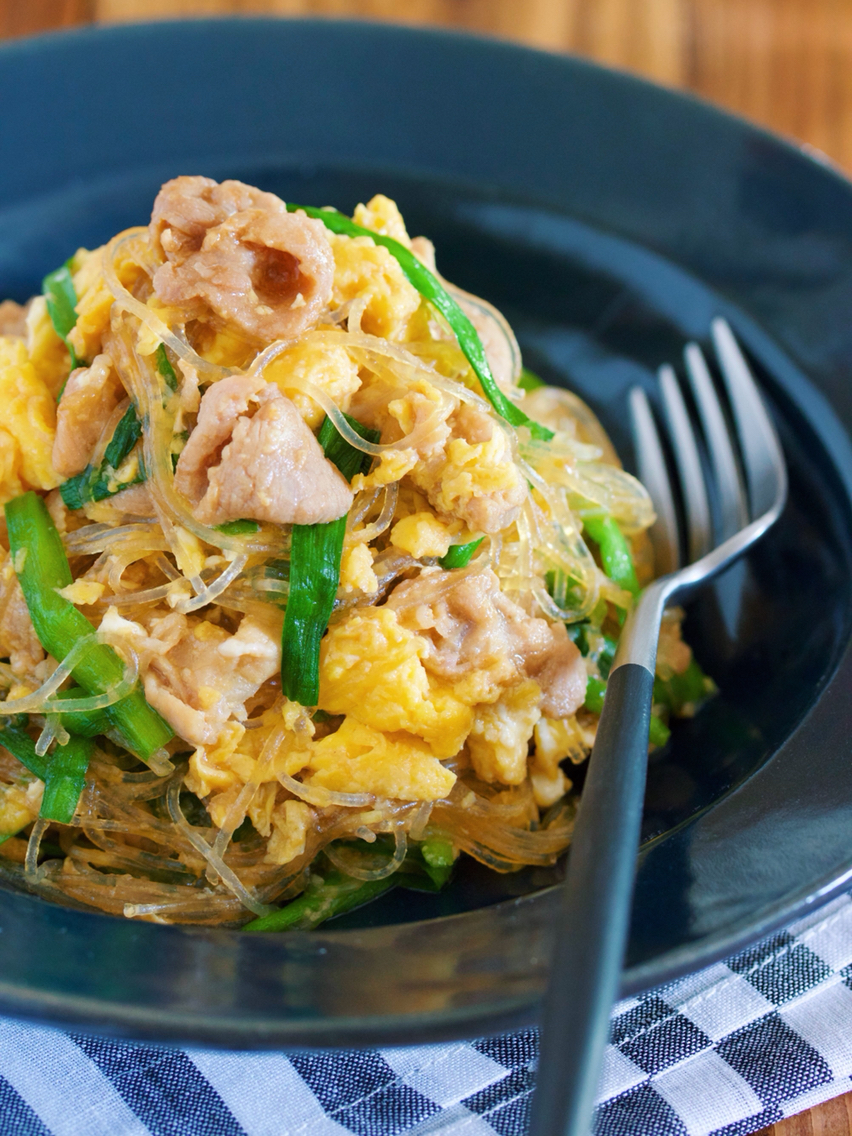 はるさめの別茹で不要♪味がしみしみ♪『コクうま♡ニラ玉はるさめ』