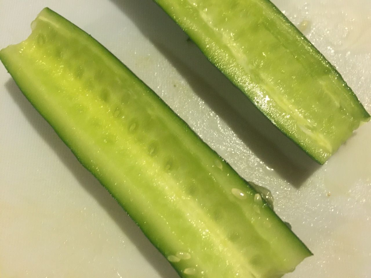 きゅうりの種はお好みで♪種を取り除いたほうが、水っぽくならず、見た目もいいのでオススメです♪
