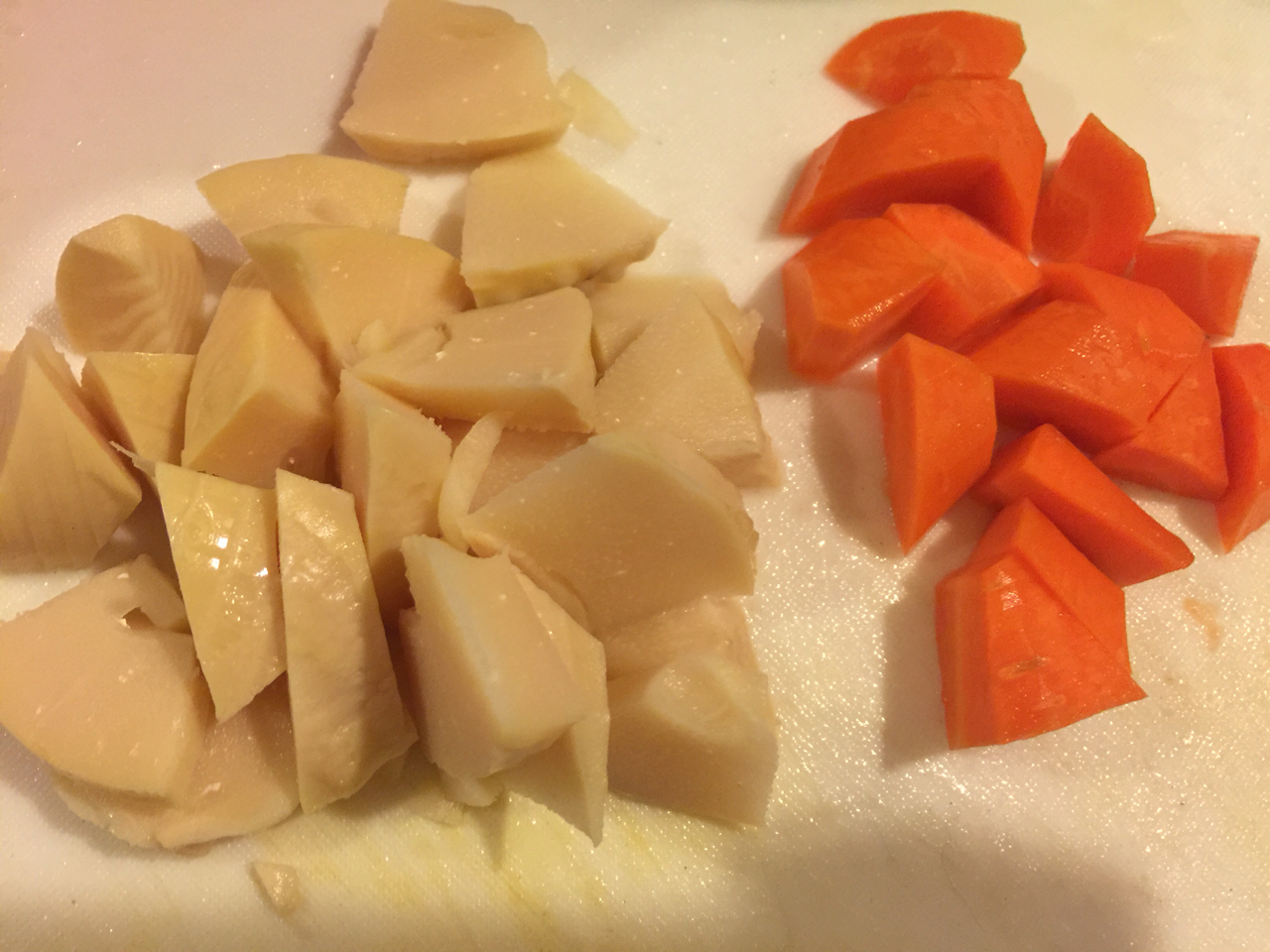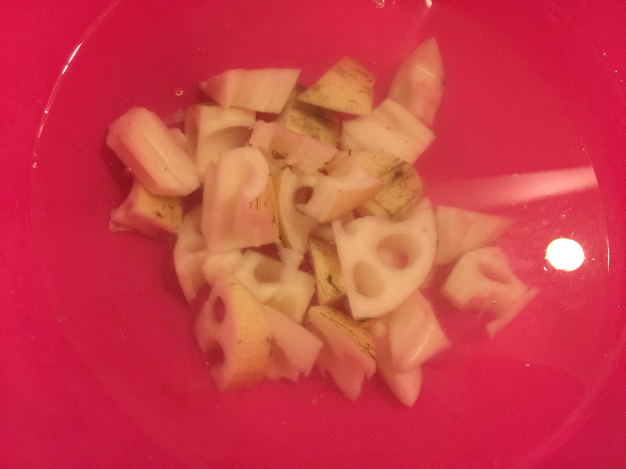 ・ゴボウは、皮をこそげ取り乱切りに、レンコンも皮をむいて乱切りにする。それぞれ水に放っておく。
