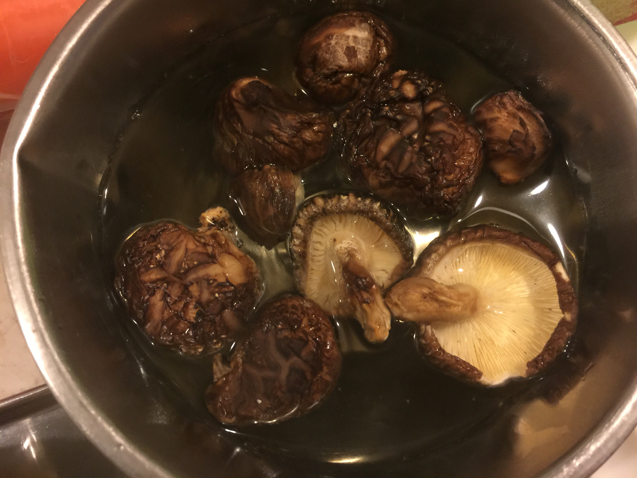 ・干し椎茸は、ぬるま湯につけて戻し、石づきを取って半分に切っておく。
