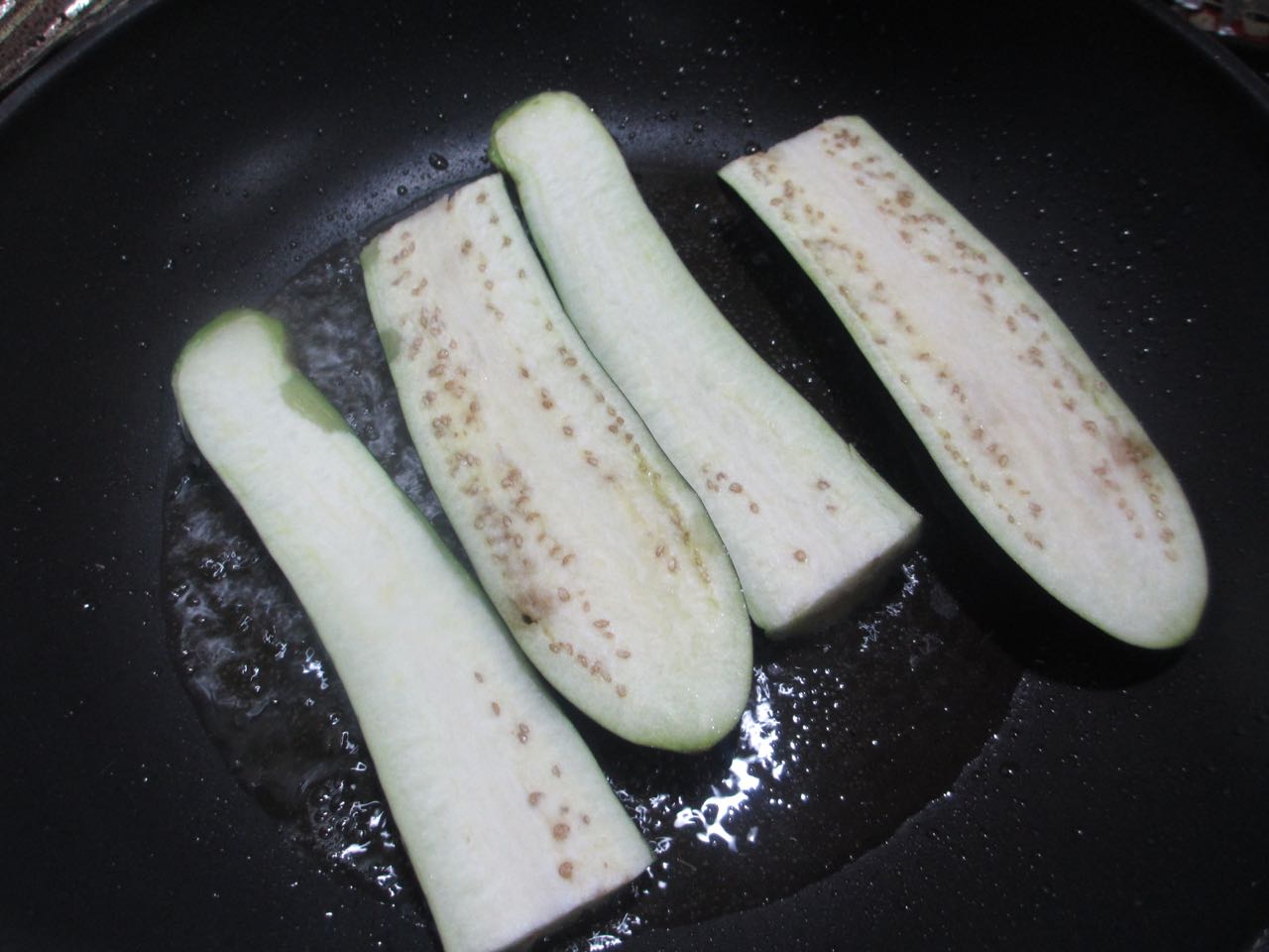 ナスを焼く際、水気をよく拭き取ってから、フライパンに入れて下さい。水気が残っていると、油ハネの原因になります。