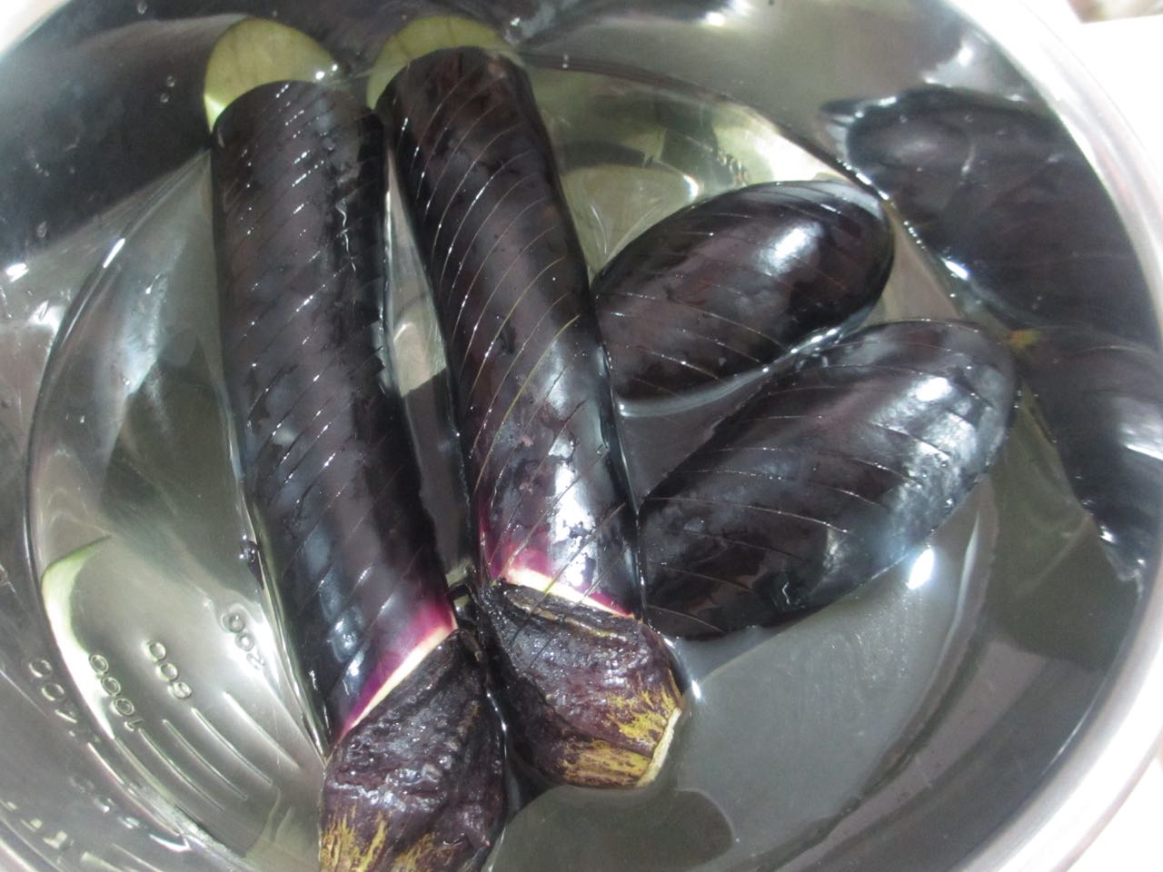 ナスの切り込みは、面倒であれば入れなくても結構ですが、入れた方が味しみがよくなります。