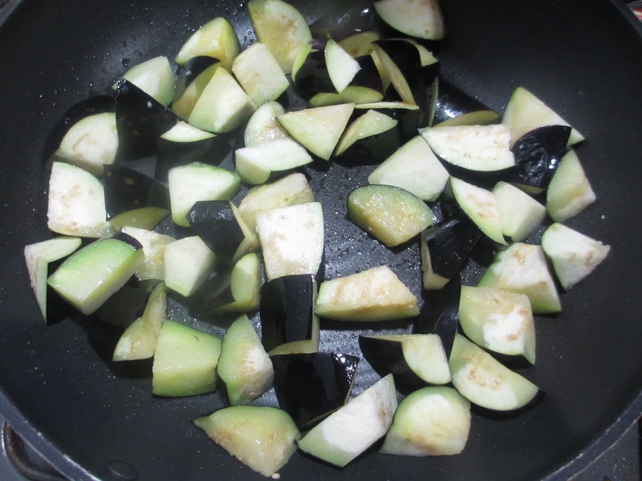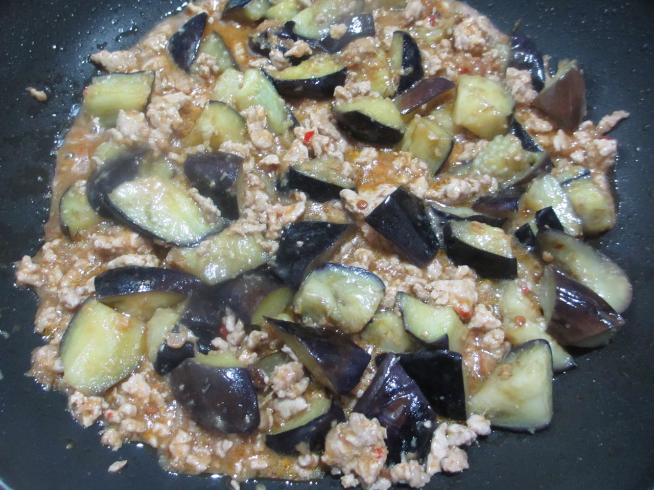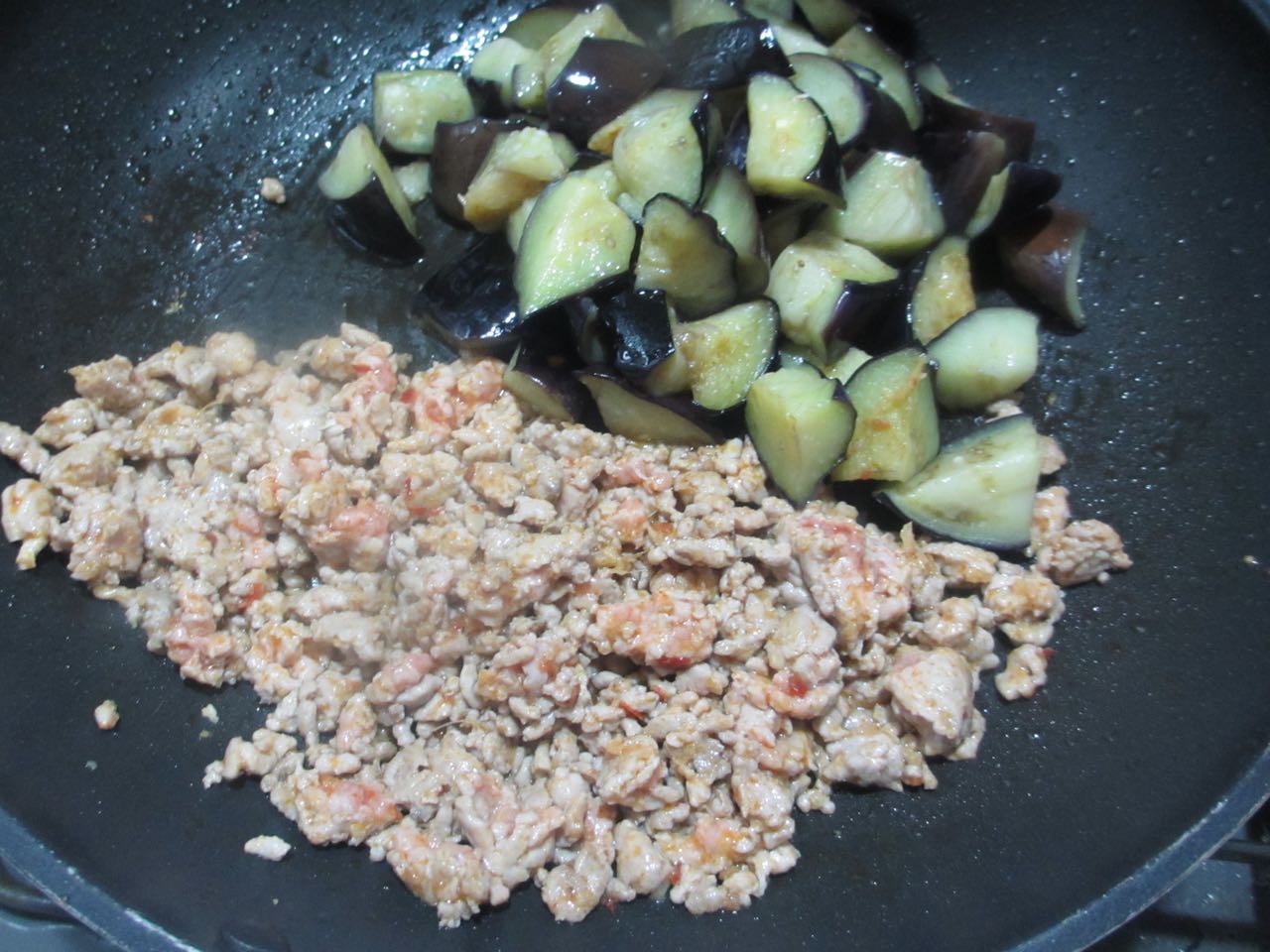 肉味噌にナスを加えて