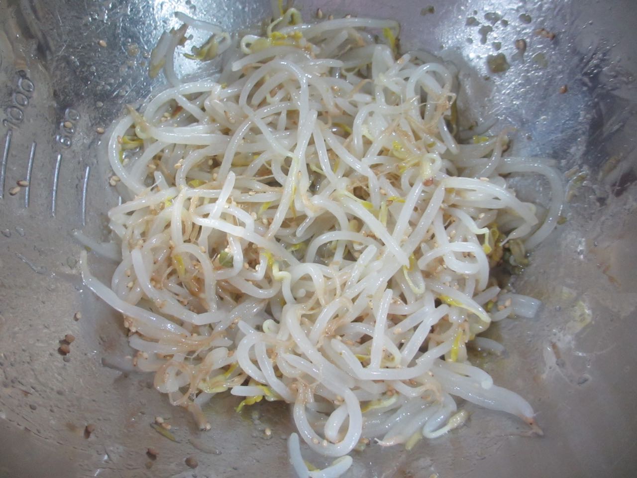 必ずもやしの熱が冷める前に和えて下さい。もやしが冷めてから和えると、鶏ガラスープの素が溶けきれず、味しみも悪くなります。