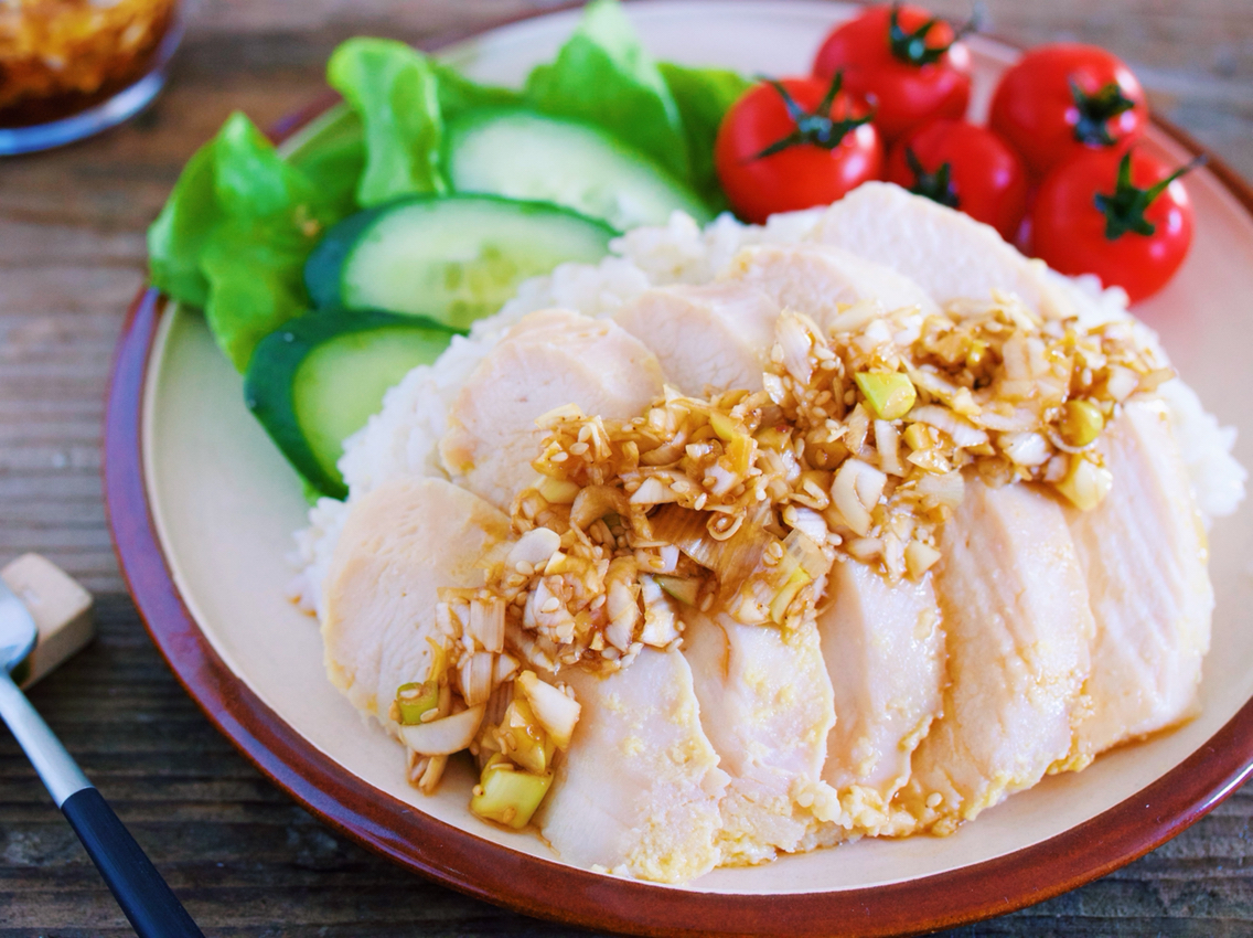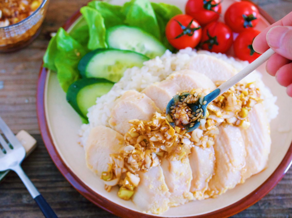 シンガポールチキンライスをレンジでお手軽に仕上げました。ご飯にはチキンのエキスがしみしみ。むね肉で作った蒸し鶏は感動の柔らかさ♪これに、香味野菜たっぷりの甘酢ダレをかけるともう、やめられない止まらないっ!! 15分もあれば出来上がるので夏休みのランチにもオススメです♡