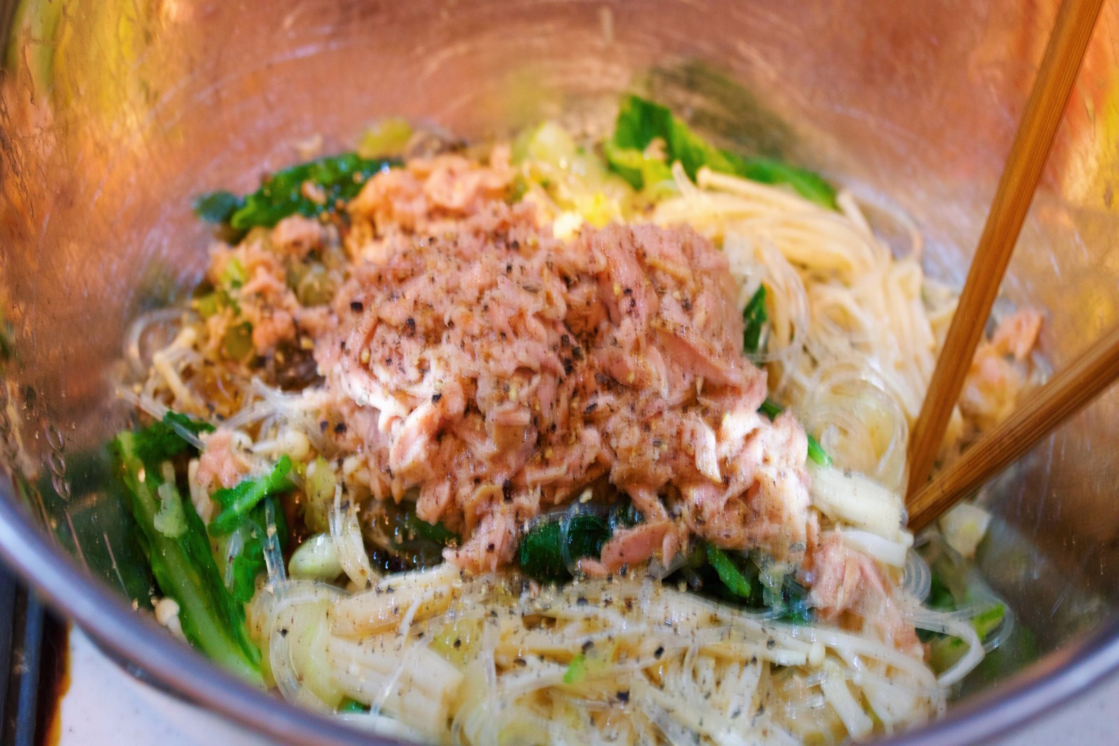 ゴマ油は、最後に混ぜ合わせると、味がよく染みます。