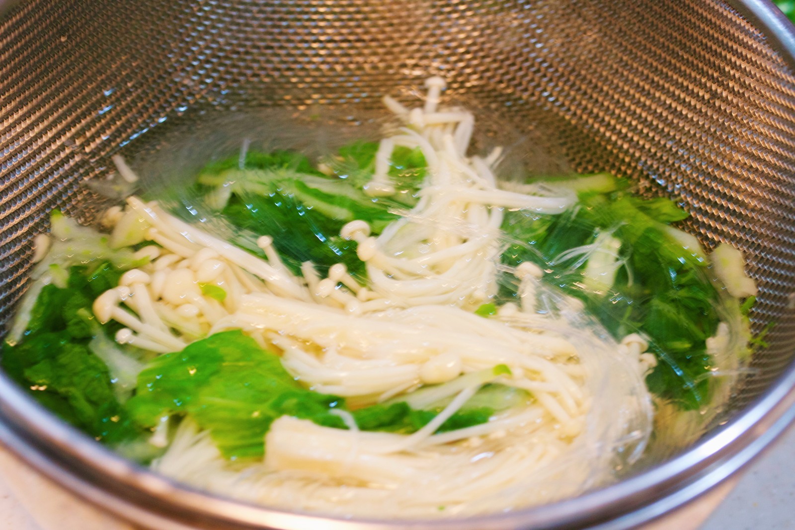 ザルに材料を重ねて、熱湯をまわしかけ