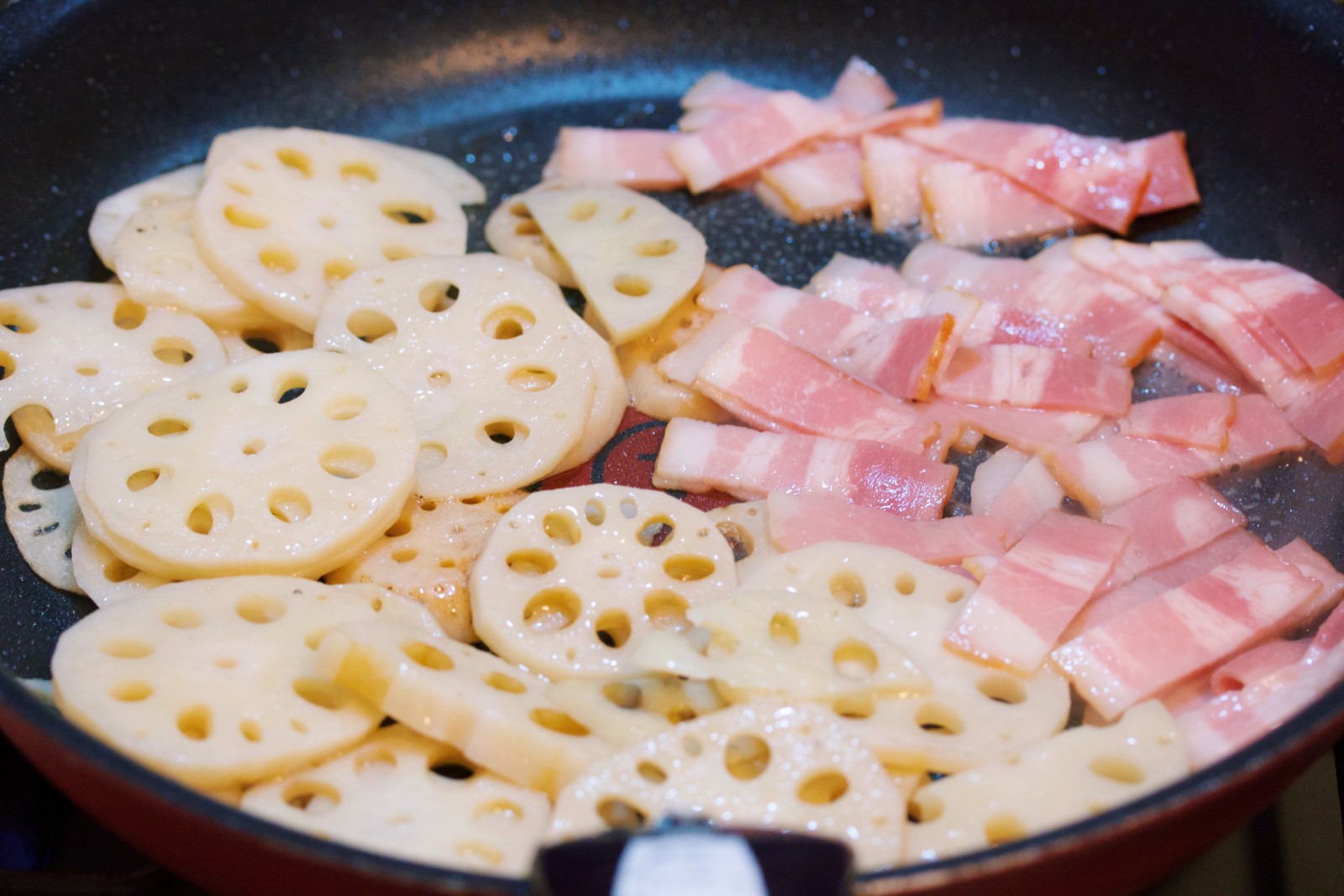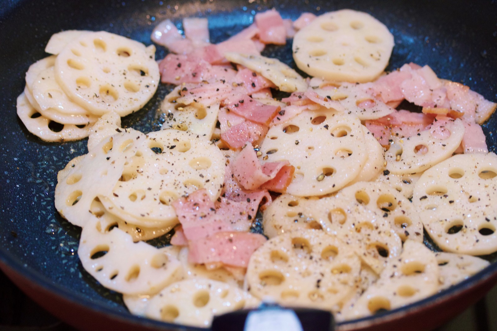 フライパンでれんこんとベーコンを炒め