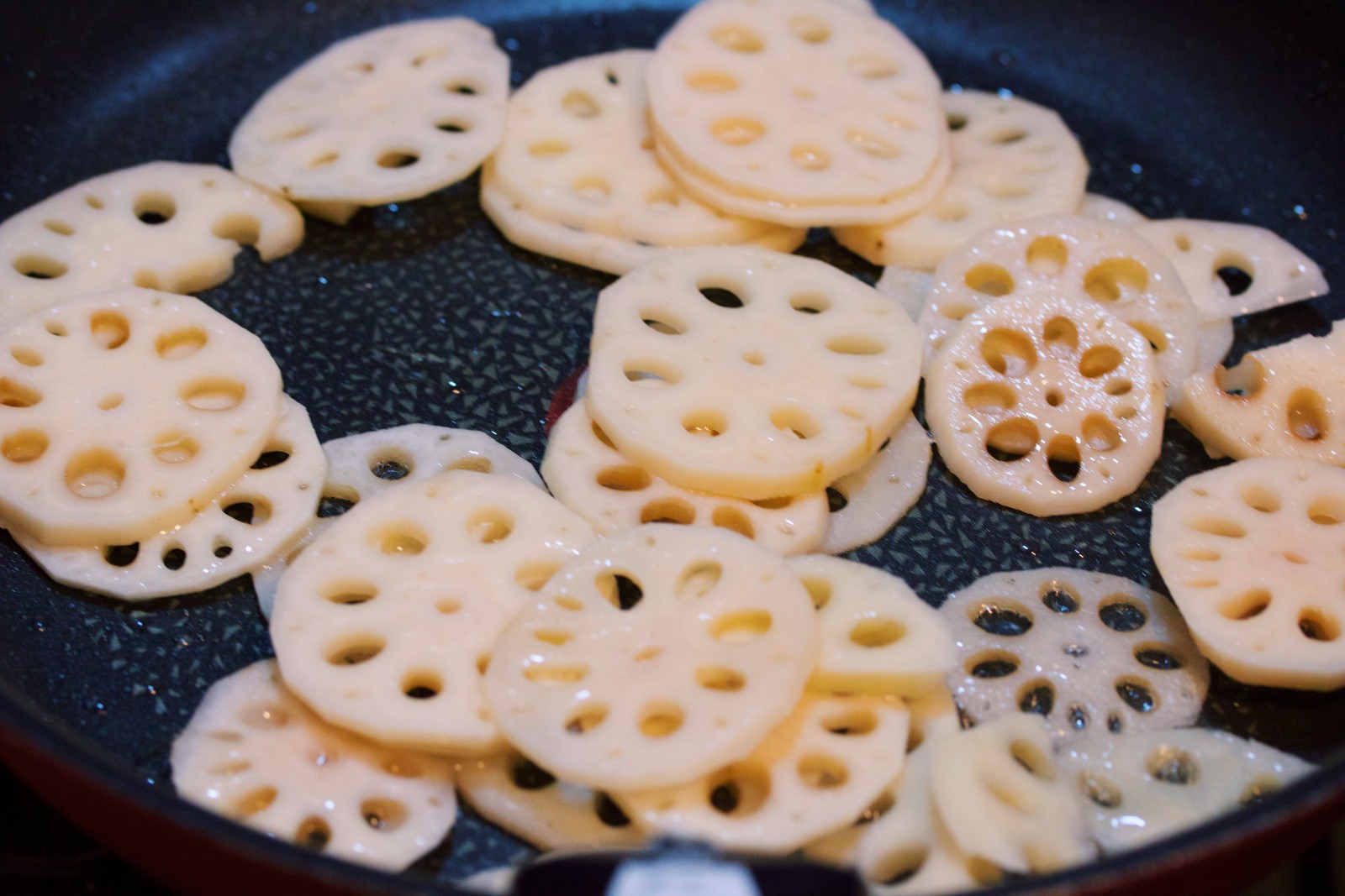 れんこんは、終始炒めるというよりは、広げて焼き、時々ザッと混ぜ合わせる感じでOKです。