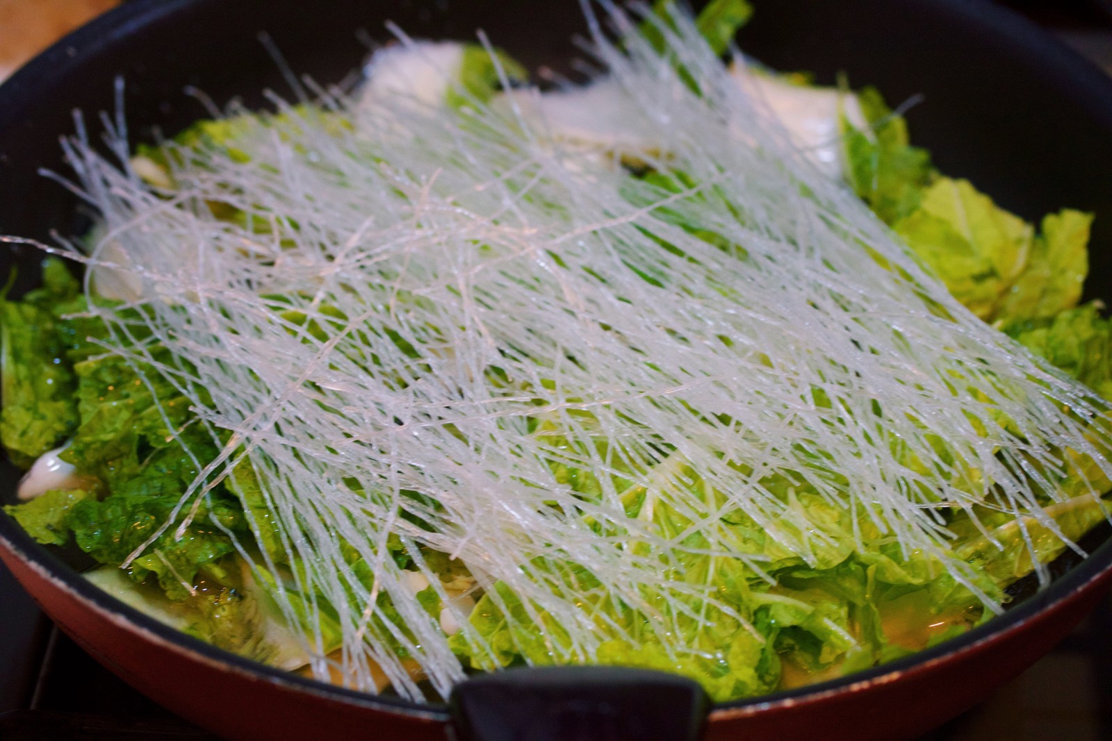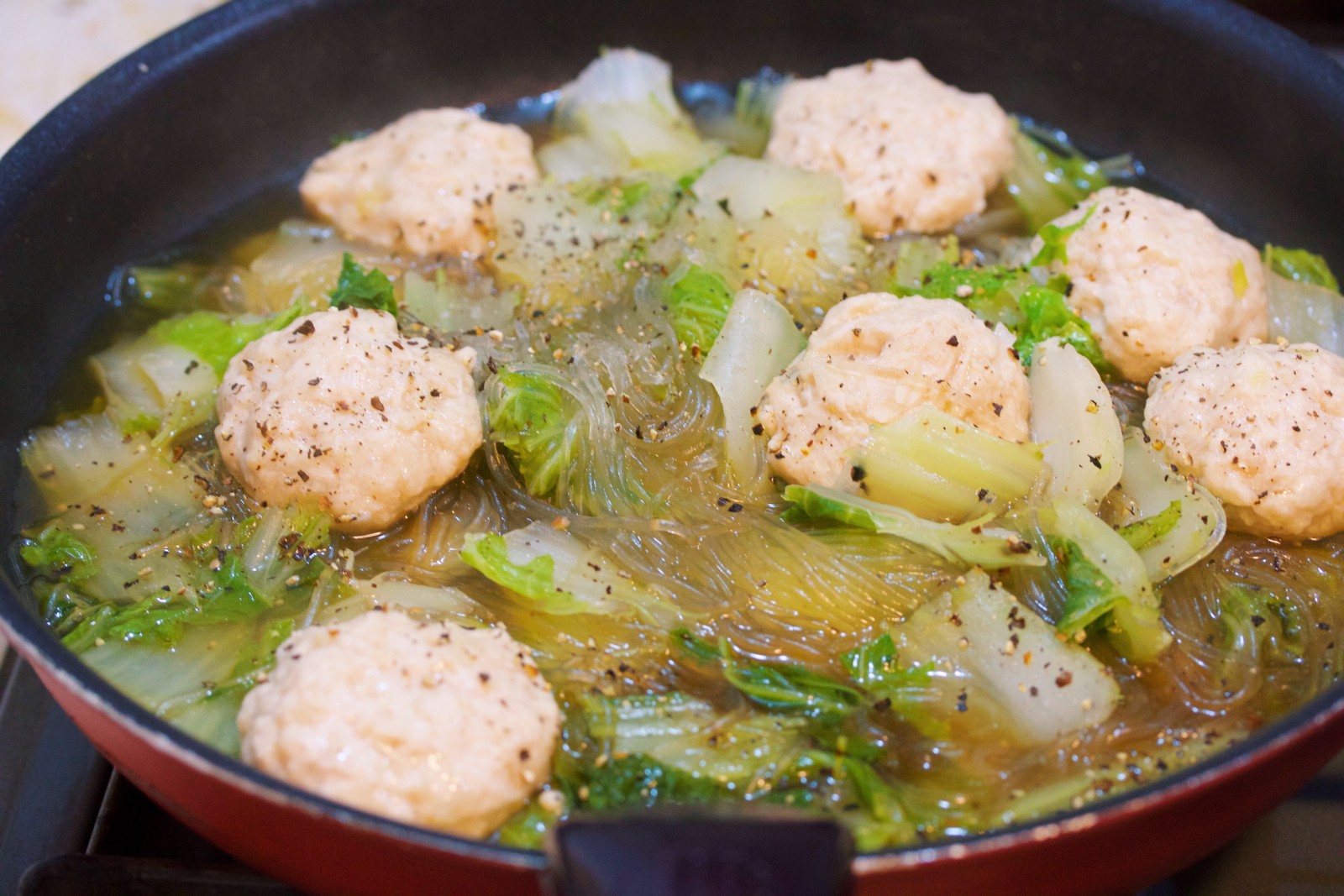 フライパンに材料を重ねたらあとは、10分蒸し煮にするだけ。じっくり蒸された白菜はとろとろで甘く旨味を吸ったはるさめも最高に美味しいっ!また、今回は鶏団子も最初から重ねて煮ているのでスープに旨味エキスがたっぷり♡汁までゴクゴクと飲み干したくなる美味しさです( ´艸`)