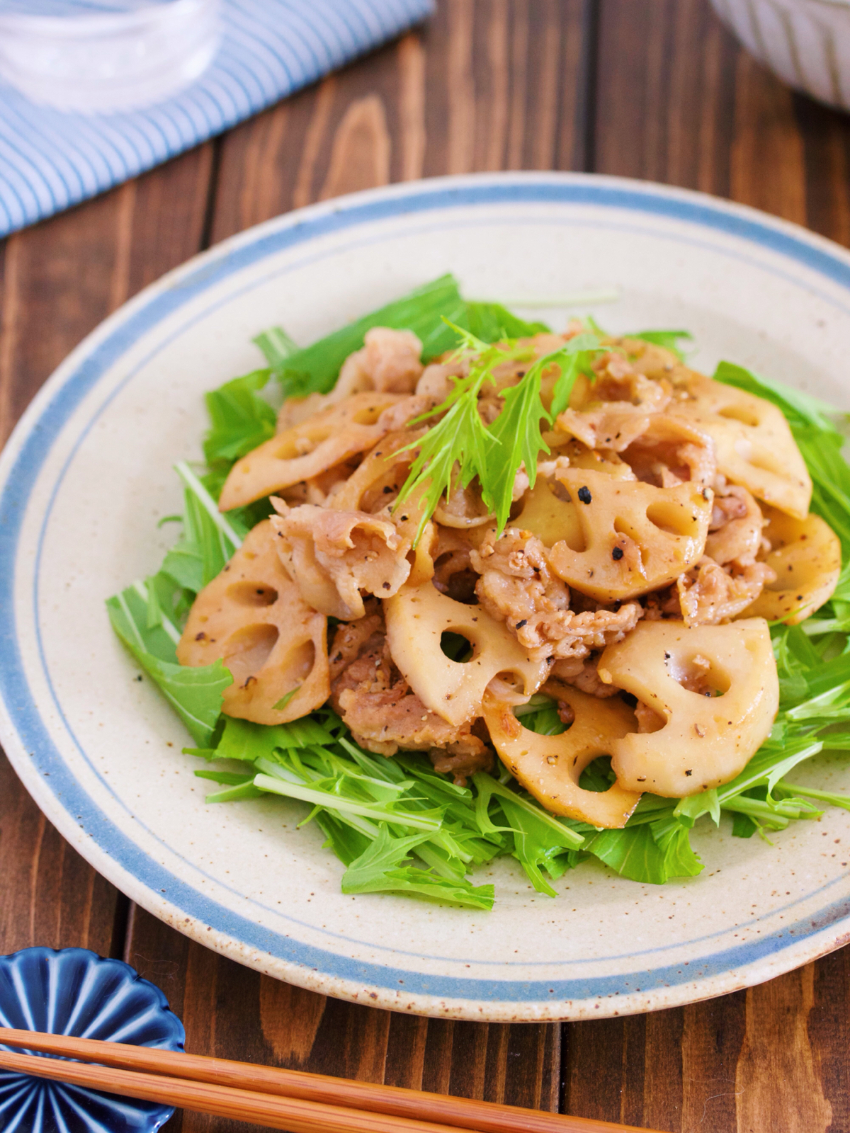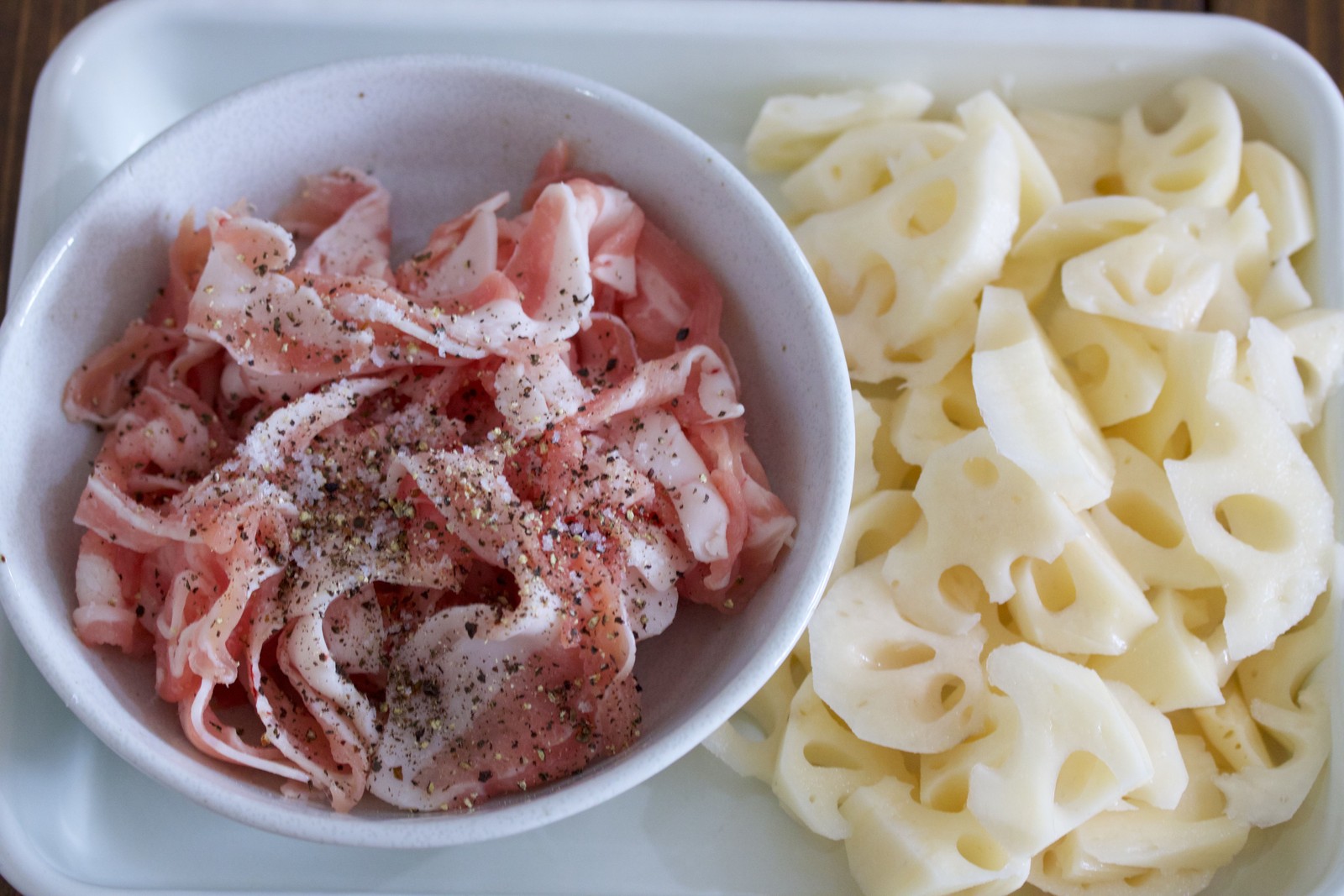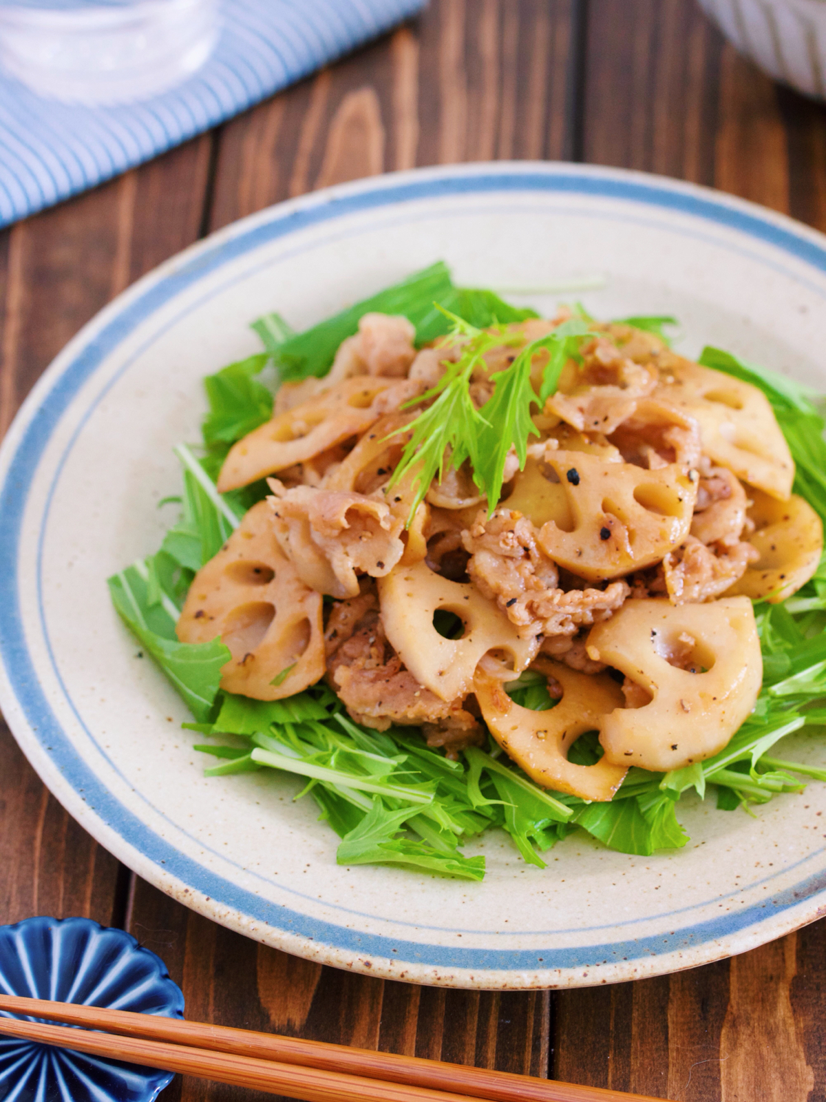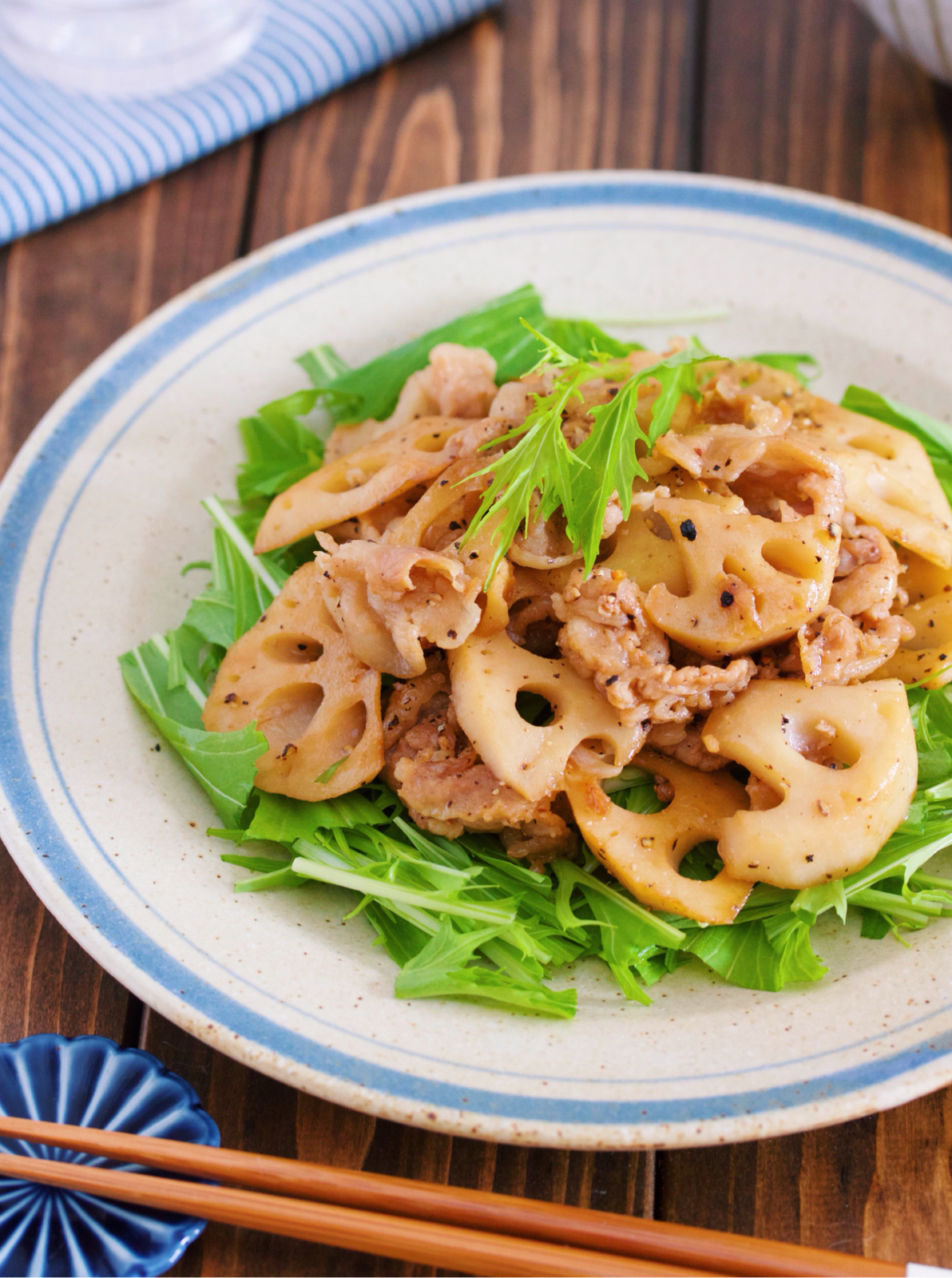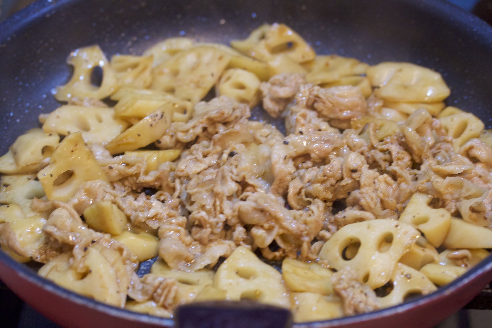 『豚バラれんこんの塩昆布ポン酢ソテー』