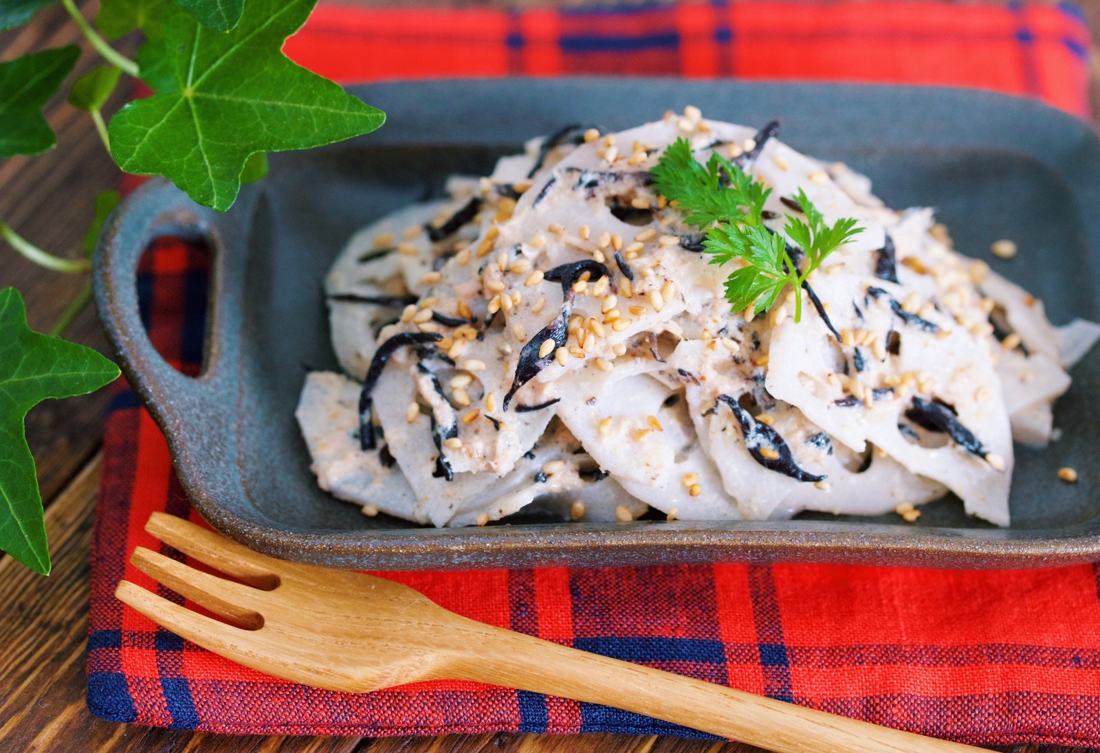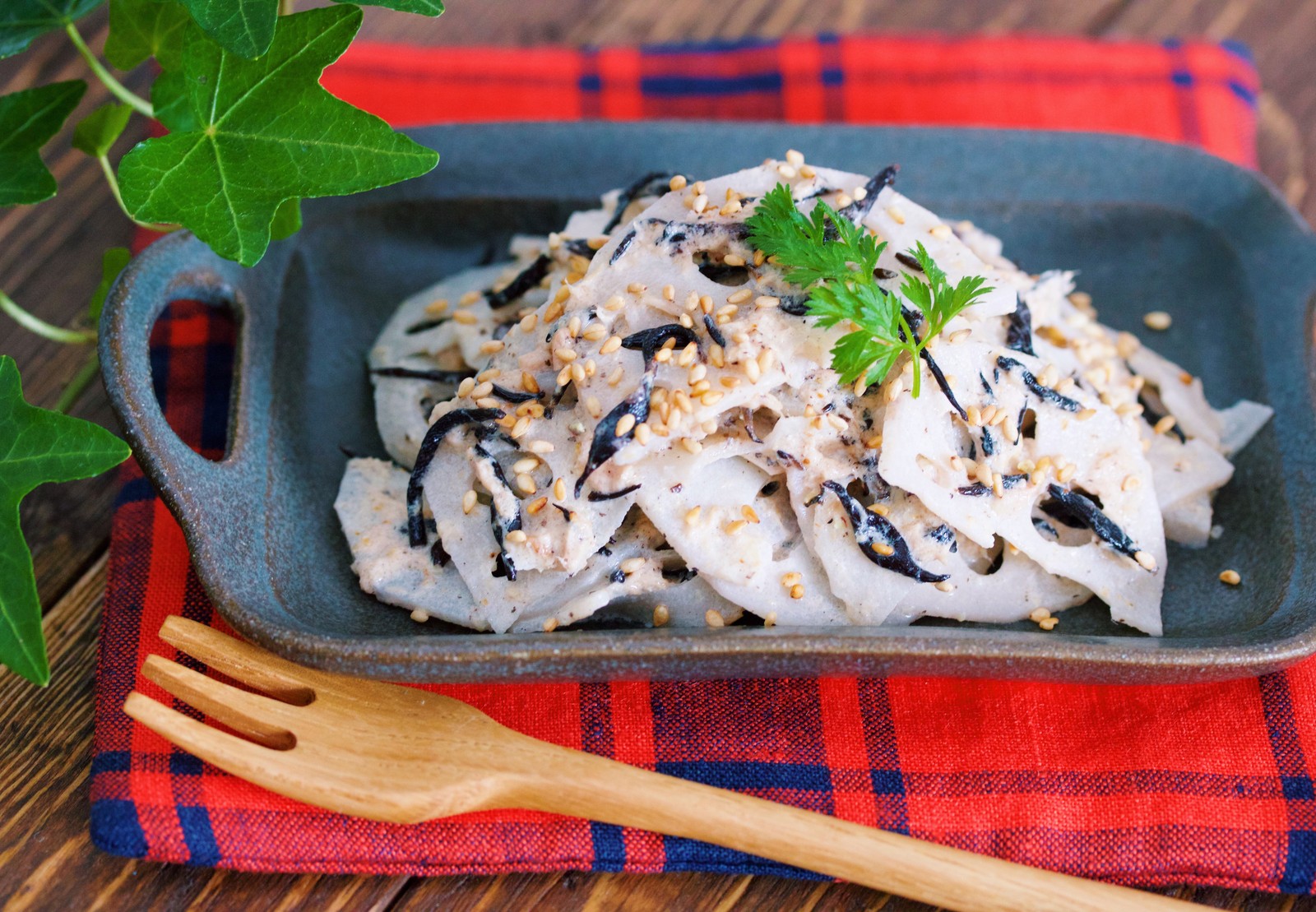 今が旬の”れんこん”を使った栄養満点の作り置きサラダ♪作り方は、とーっても簡単でれんこんをサッと茹でたらあとは、ひじき・ツナ缶・マヨネーズ・ごまで和えるだけ。 たったこれだけだけど旨味とコクがたっぷりで思わず抱えて食べたくなるほど♪しかも、不足しがちな海藻類も一緒に摂れるのが嬉しい。