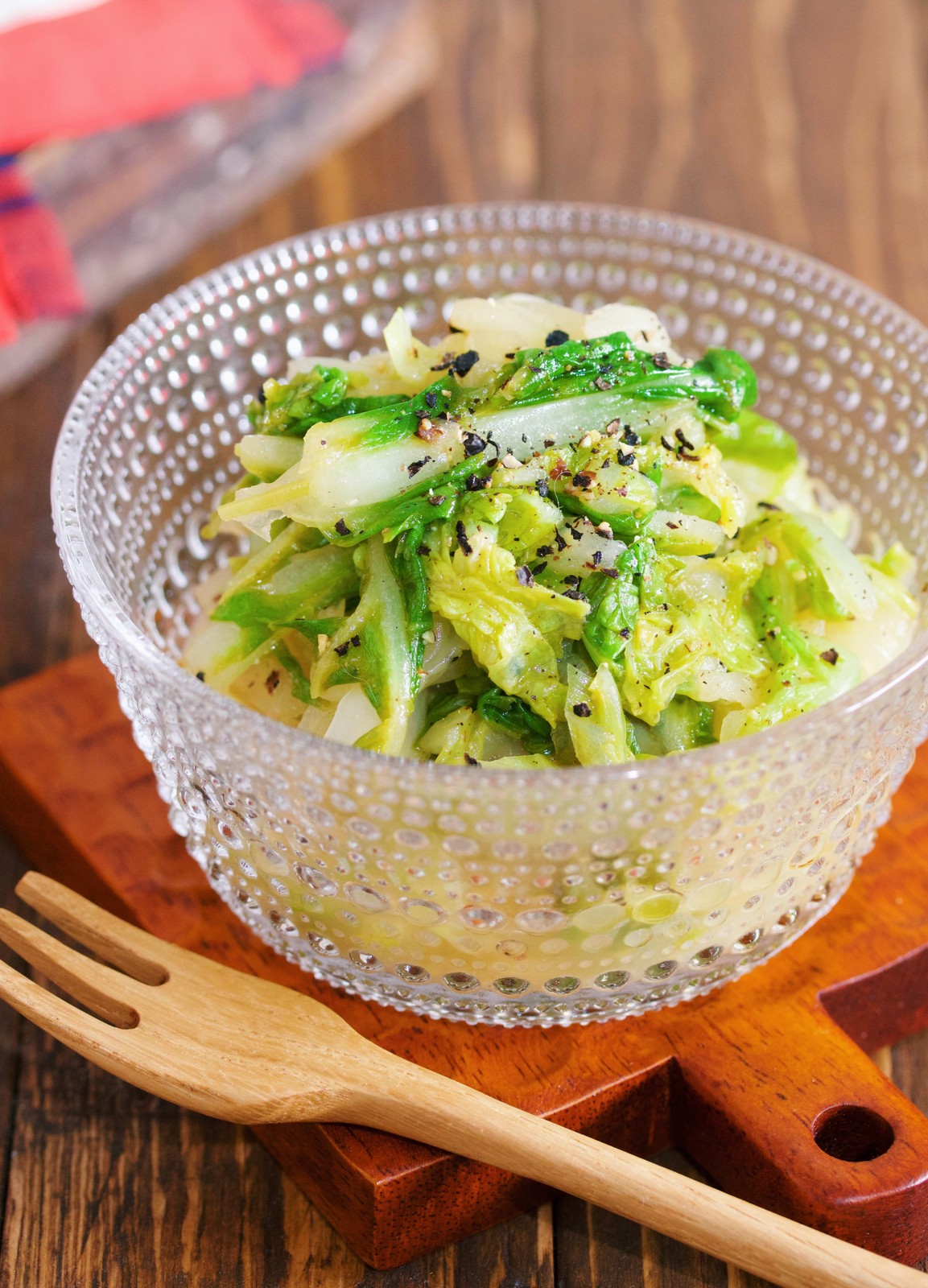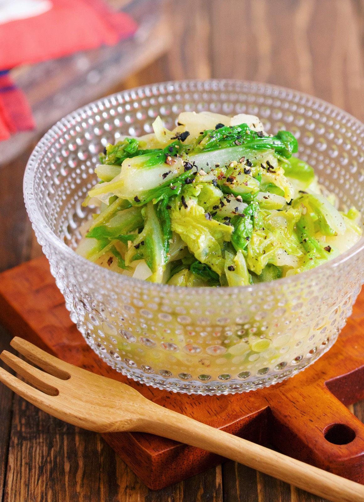 白菜だけを使ったサッパリ系やみつき副菜♪作り方は、とっても簡単で白菜にお湯をかけたらあとは、レモン汁・鶏ガラ・白だしそして、砂糖・ごま油で和えるだけ。 たったこれだけだけど歯ごたえはシャキシャキあと味サッパリ。そして、レモン汁+粗挽き黒胡椒のパンチがお箸を次から次にすすませます♪お酒にもぴったりですよ〜!