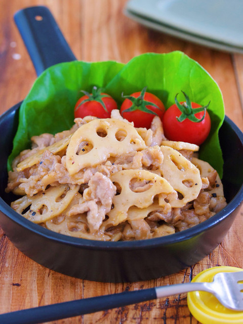『豚バラれんこんの塩昆布ポン酢ソテー』