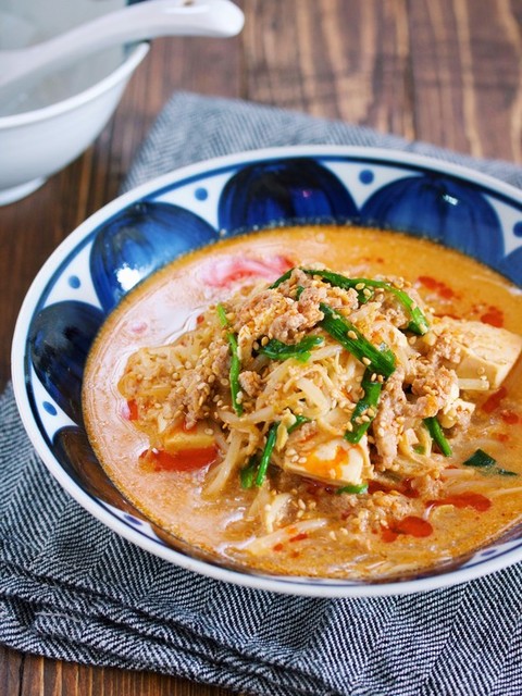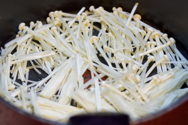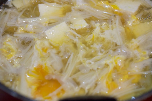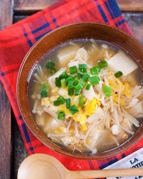 お鍋でえのきだけを蒸し焼きにしてあとは煮汁と豆腐を加えて3分ほど煮最後に、溶き卵を回し入れたら出来上がり♪ポイントは、えのきだけの蒸し焼き。こうすることで、旨味が凝縮されえのきだけ独特のとろみがでるので水溶き片栗粉なしでもトロトロのスープが完成しますよ〜。