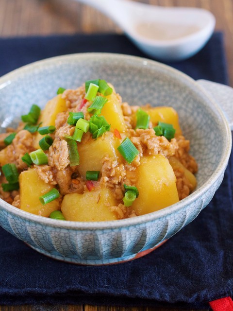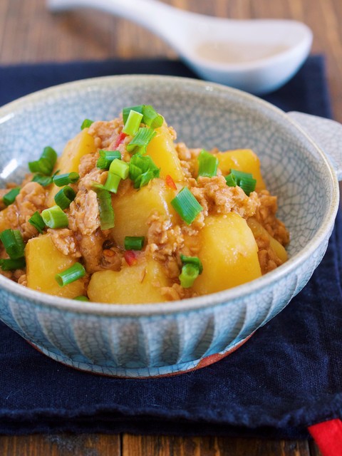 ”新じゃがいも”×”豚ひき肉”を使った麻婆風のそぼろ煮。作り方は、とーっても簡単で鍋でひき肉とじゃがいもをサッと炒めたらあとは煮汁を注いで10分ほど煮るだけ。最後にとろみをつけることでじゃがいもによく味が絡み短時間の煮込みでも満足感アップ!しかも、とろみをつけることで冷めにくくなるので、今日みたいに寒くなる日にはピッタリです♪