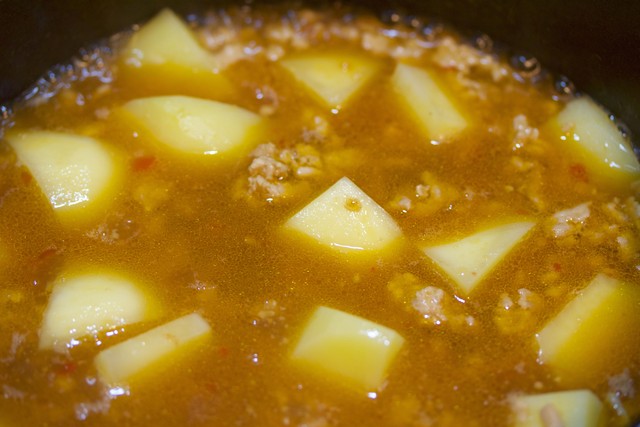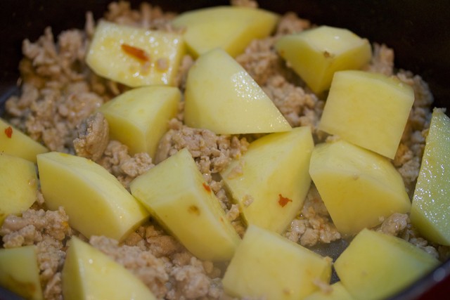 鍋でひき肉とじゃがいもをサッと炒めたら