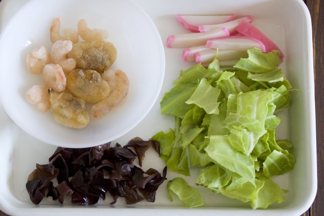 2.かまぼこは細切りにし、春キャベツは手でちぎる。きくらげはたっぷりの水で戻し、細かく刻む。緑豆はるさめは、スープジャーに入りやすい長さに切っておく。