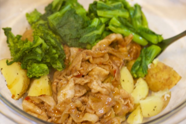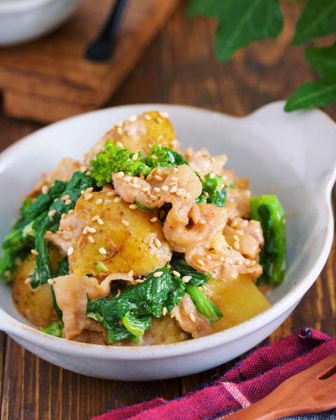菜の花と新じゃがと合わせておかず風のポテサラに仕上げました♪作り方は、とーっても簡単で新じゃがはレンジでチン菜の花はサッと熱湯で茹でます。あとは、甘辛く炒めた豚肉と合わせてマヨネーズで和えたら完成です♪肉じゃが風の甘辛味なので男子もお子様も喜びますよ♡