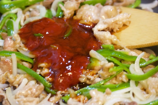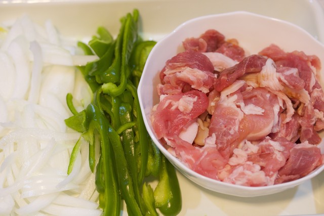 豚こま・玉ねぎ・ピーマン。