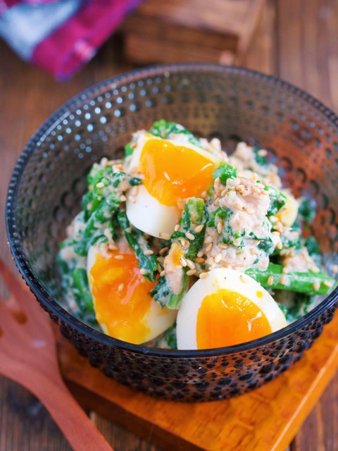 ゆでた菜の花に半熟卵を加えてツナマヨ+めんつゆ+ごまで和えるだけ。 たったこれだけだけどツナマヨのコクで菜の花の苦味が軽減♪菜の花のほろ苦さと卵の甘さもベストマッチですごーく食べやすくなりますよ( ´艸`)また、卵が入ることで彩りも一気に華やかになるのが嬉しい♪