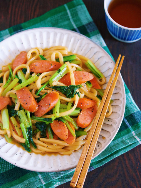 『青菜とウインナーの和風焼きうどん』