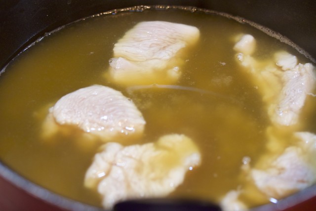 を沸騰させ、鶏むね肉を弱火で2〜3分煮ます。