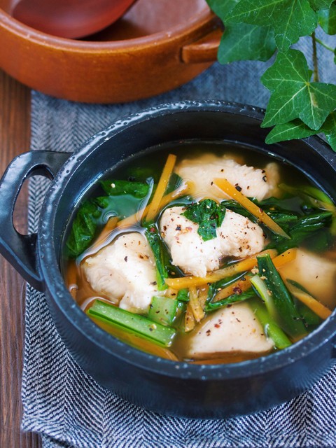 鶏むね肉は片栗粉を揉み込むので柔らかもちもち食感に。そして、自然にスープにとろみがつくのも嬉しい♡作り方は、とっても簡単で鍋にスープを沸騰させ、鶏むね肉を弱火で2〜3分煮ます。あとは、小松菜とにんじんを加えてサッと煮たら出来上がり♪粗挽き黒胡椒とごま油をふればむね肉と野菜だけのヘルシーなスープでも大満足の一品に( ´艸`)