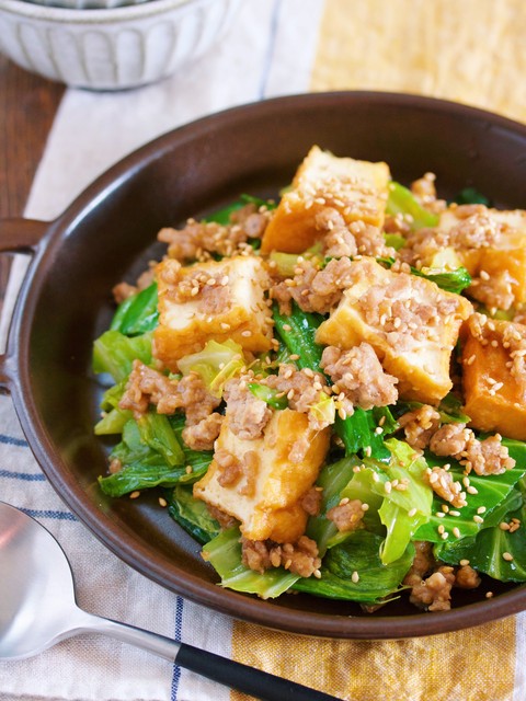 フライパンでひき肉・厚揚げ・キャベツを炒めたらあとは、しょうががきいた甘辛味噌だれを絡めるだけ。 ポイントは、タレに加える片栗粉。これを入れることでタレが具材にしっかり絡みよりご飯がすすむ一品に٩(*´︶`*)۶ ҉ コスパも抜群ですので機会がありましたらぜひぜひお試しくださいね^^♪