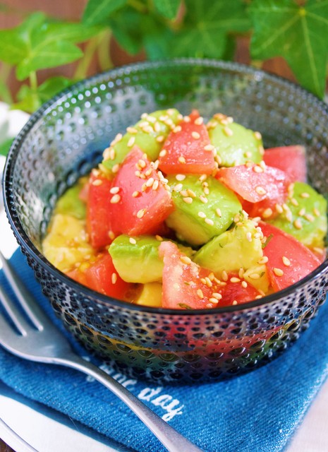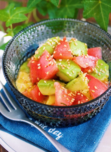 切って和えるだけ3分でできるスピード副菜をご紹介させていただきます♪ 使う食材は、女子も大好きな”アボカド”×”トマト”。これを、白だし・レモン汁・オリーブオイルそして砂糖を合わせたドレッシングで和えるだけ♡たったこれだけだけど汁まで飲み干す美味しさ!!これから暑くなる季節にはまさに最適な一品です!!また、アボカドとトマトを使うことで食卓も一気に華やかに♪
