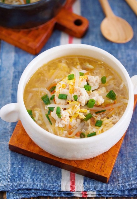 『鶏ひき肉ともやしのかき玉スープ』