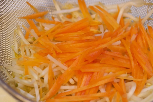 もやしとにんじんは、熱湯を回しかけます。