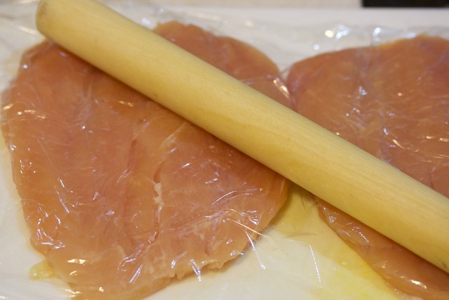 鶏むね肉を観音開きにして麺棒で叩き