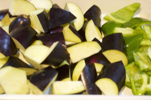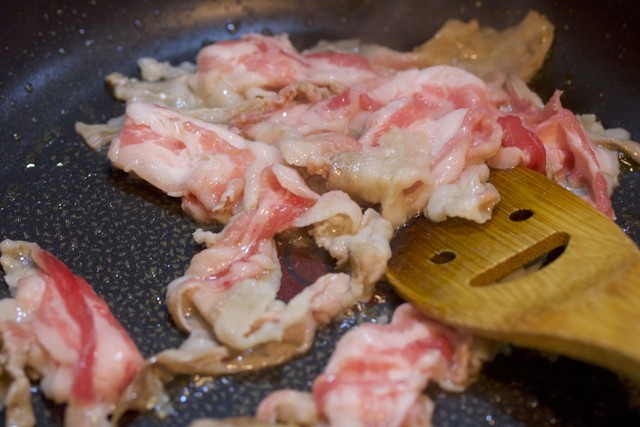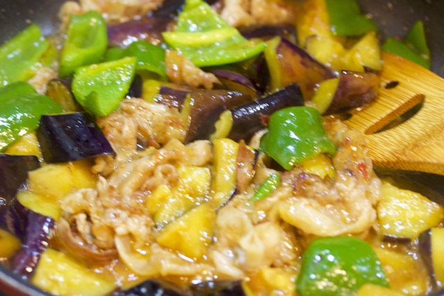 フライパンで、豚バラ→なす→ピーマンの順に炒め