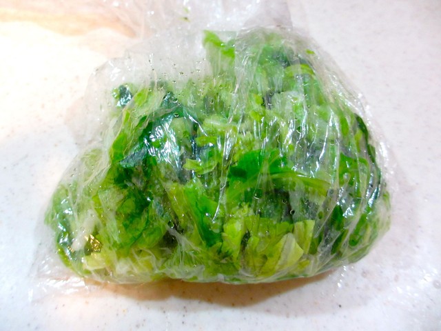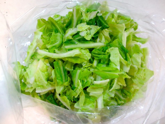 春キャベツを手でちぎってポリ袋に入れ