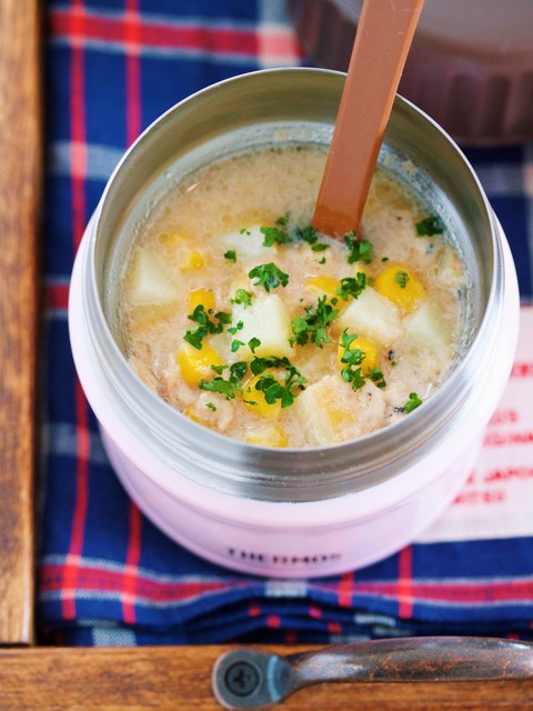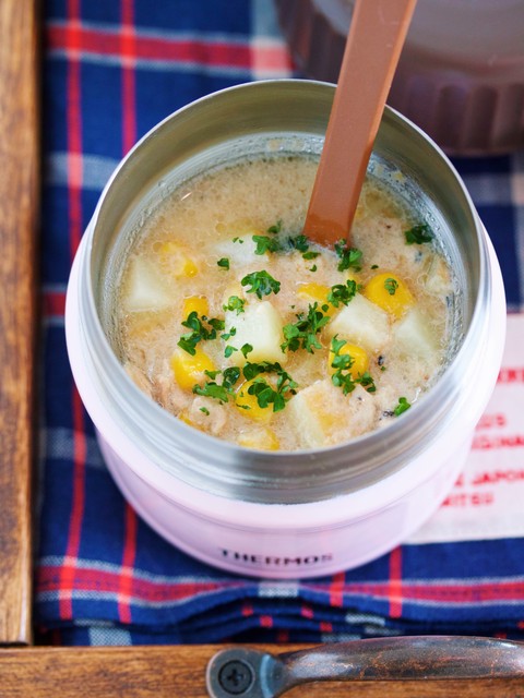新じゃがいもを小さめの角切りにしコーン・ツナ・牛乳と共にお鍋に入れサッと煮たら、あとはスープジャーに入れるだけ。食べる頃には、じゃがいももしっかり柔らかくなっていますよ〜♪じゃがいもさえあればあとはストック食材でできてしまうこのスープ。機会がありましたらぜひぜひお試しくださいね♡