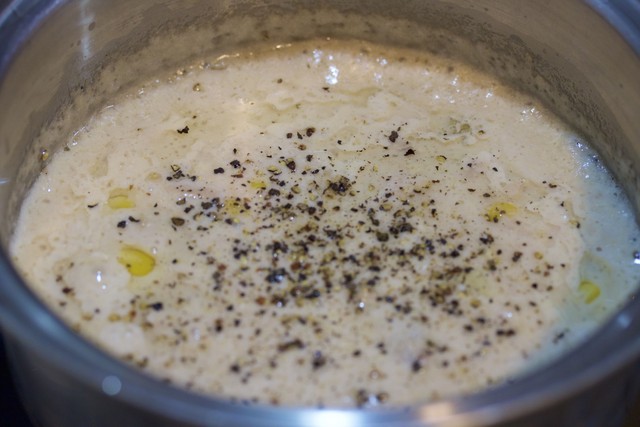 4.中火にかけ、煮たったら火を止めて、塩・こしょうで味をととのえる。