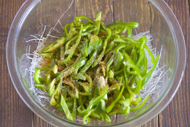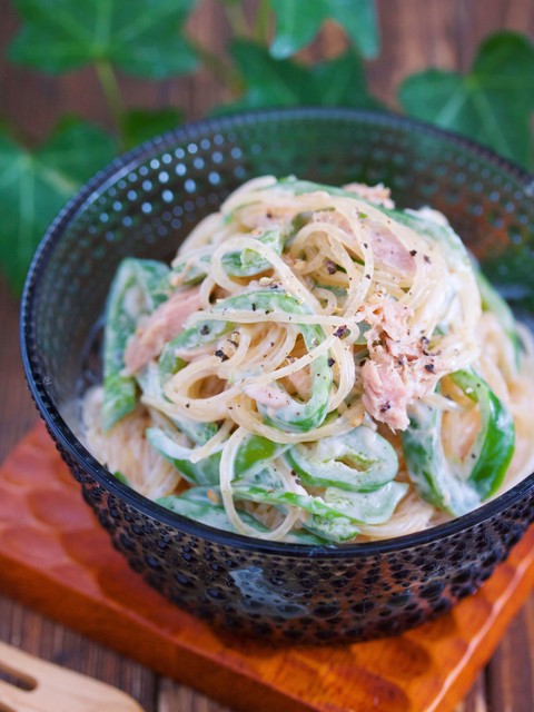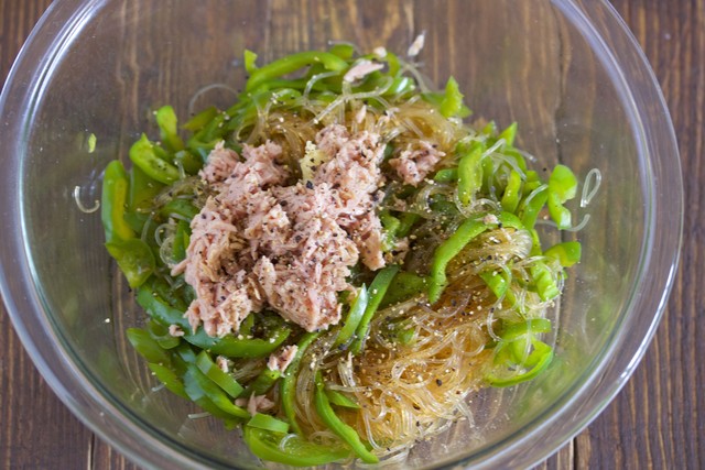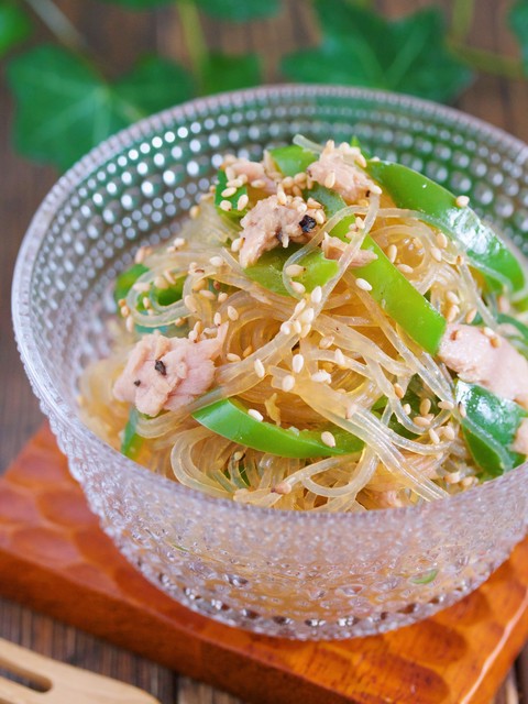 耐熱容器に春雨→ピーマンの順に重ね水・しょうゆ・砂糖を加えてレンジでチン。あとは、春雨が戻ったらツナ缶・しょうがを加えて混ぜ合わせるだけ♪たったこれだけだけど春雨は味がしみしみ!また、甘辛味+ツナの旨味でピーマンの苦味も軽減!モリモリいけちゃいますよ〜♪ちなみにこちら副菜としても使えますが夜遅い食事の時はメインにしてもOKです!