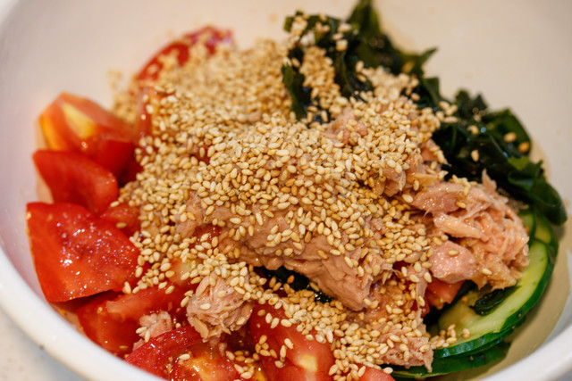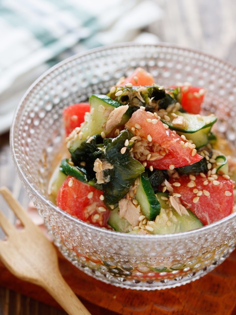 《トマトときゅうりとわかめの中華サラダ》